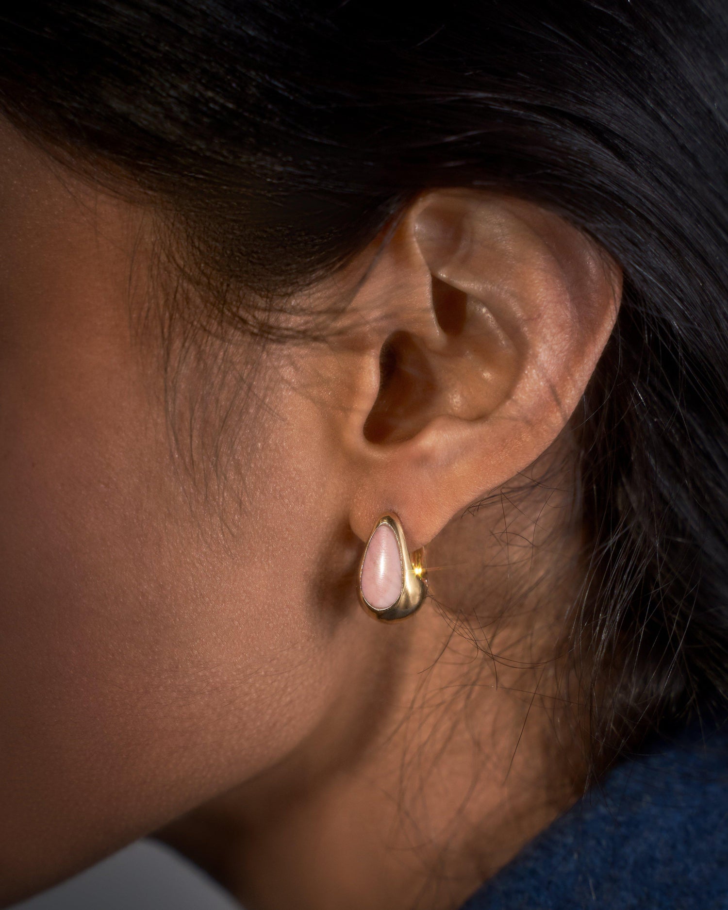 These Inlay Hammered Hoops by Pamela Love offer an organic yet sophisticated design, featuring mini hammered gold hoops with deep blue lapis inlay. Their irregular sculptural shape makes them a unique choice for everyday wear.