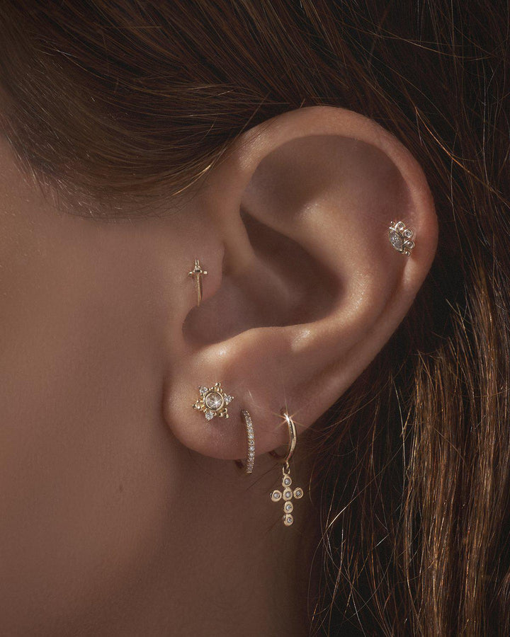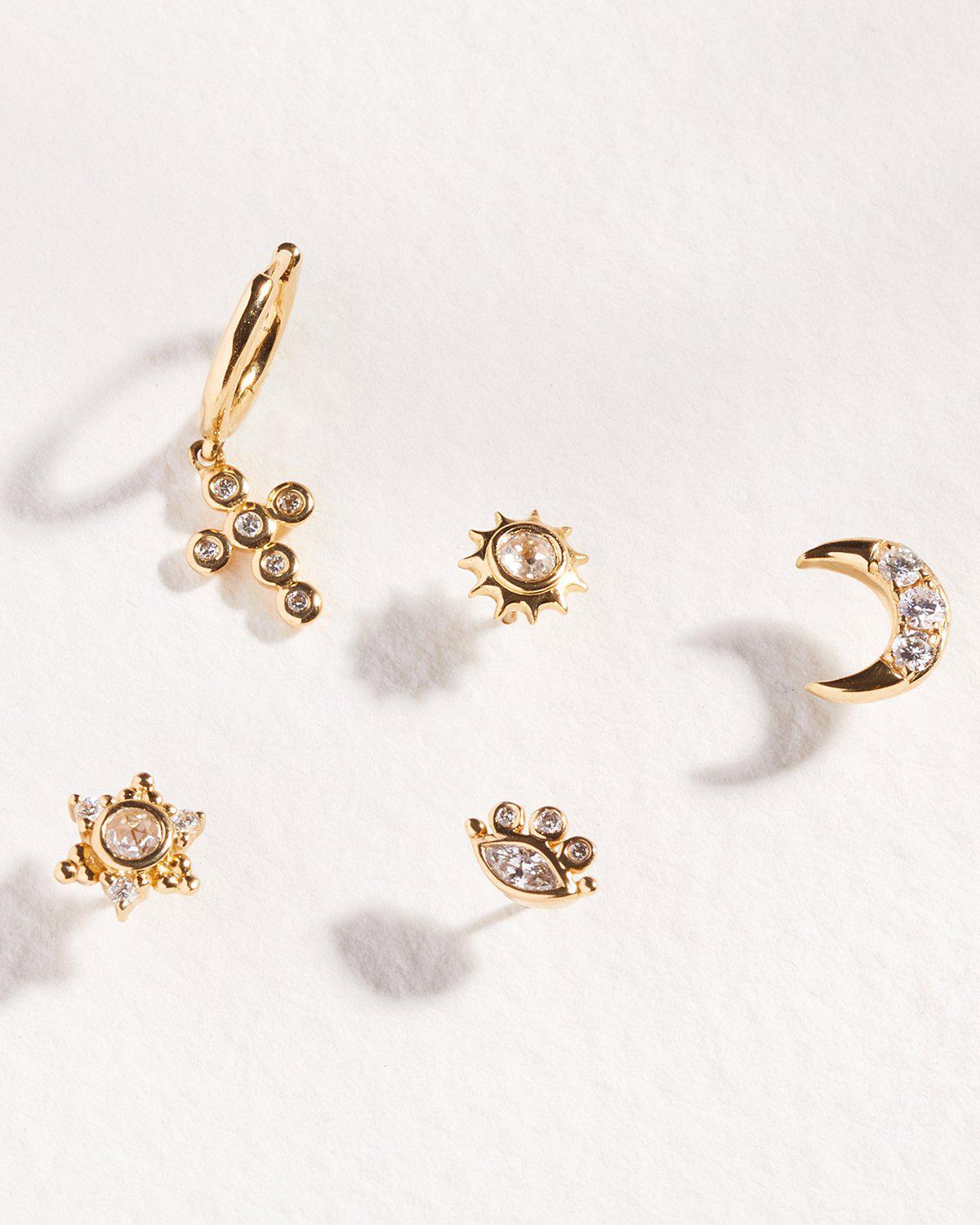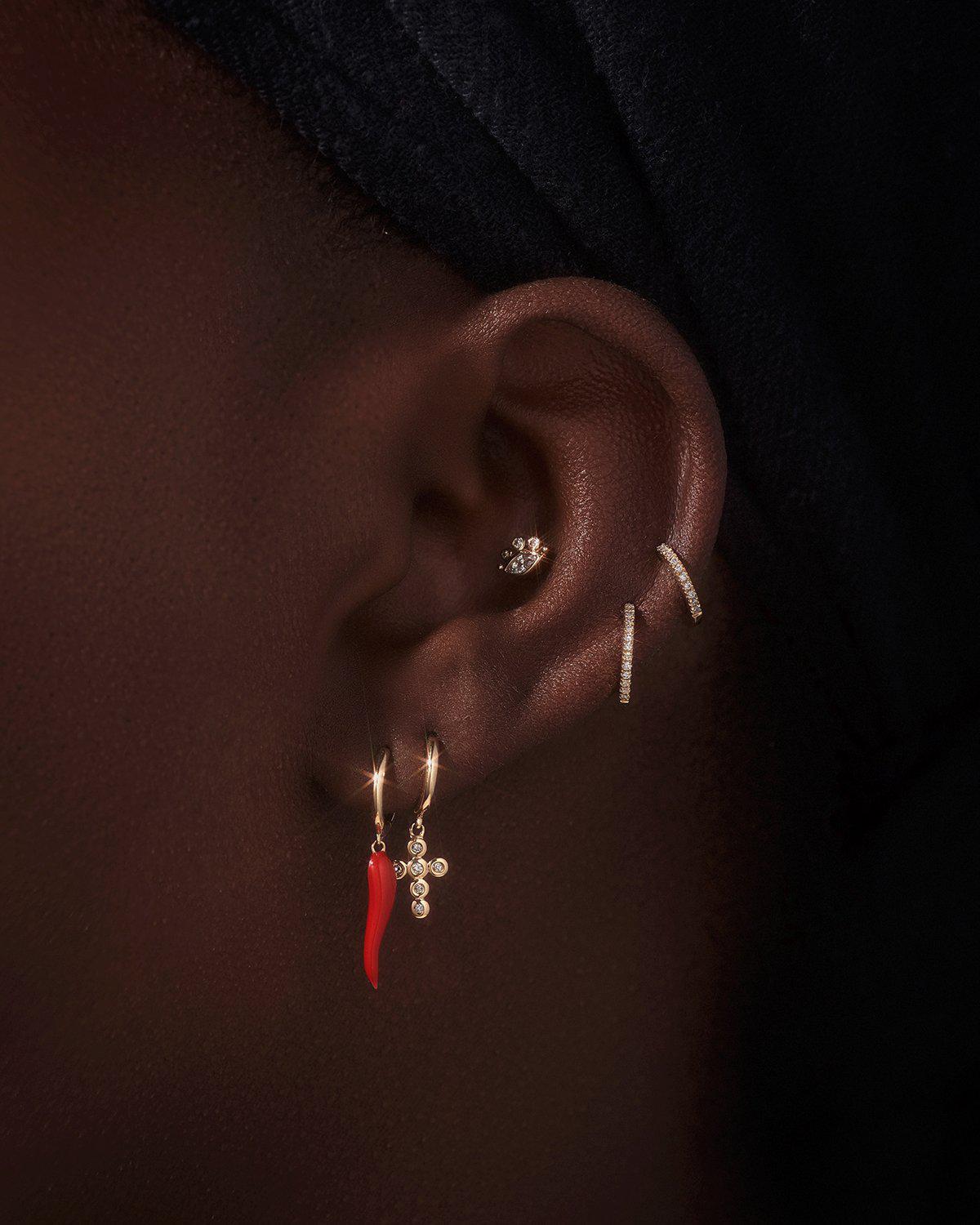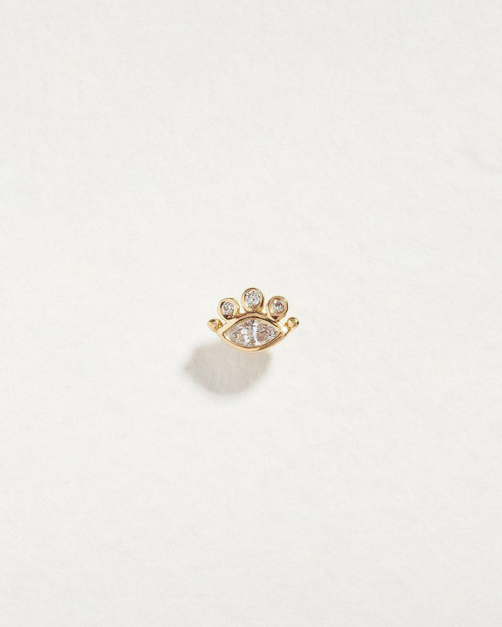 This Celestial Eye Stud by Pamela Love offers a refined interpretation of the eye motif, featuring a shimmering oval diamond encircled by tiny diamonds for a radiant sunburst effect. Wear it as a statement piece in a rook, helix, or conch piercing, or style it in your lobe for an ethereal glow.