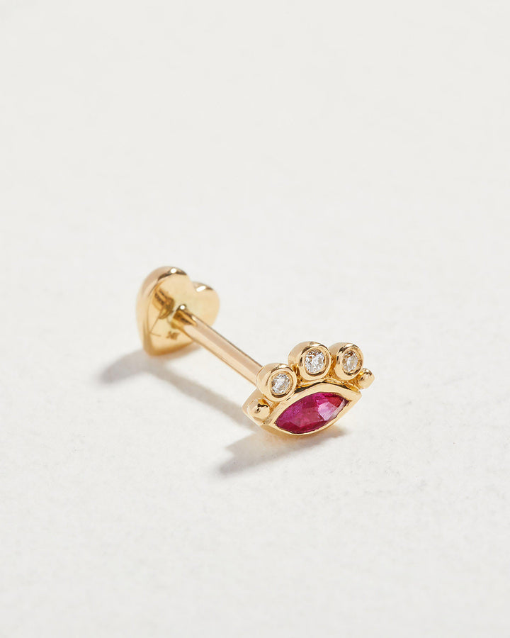 This Celestial Eye Stud by Pamela Love is a striking interpretation of the protective eye motif, featuring a deep red oval ruby at its center, accented with tiny white diamonds in a radiant sunburst effect. Designed for rook, helix, and conch piercings, this piece adds a bold yet elegant touch to any jewelry collection.