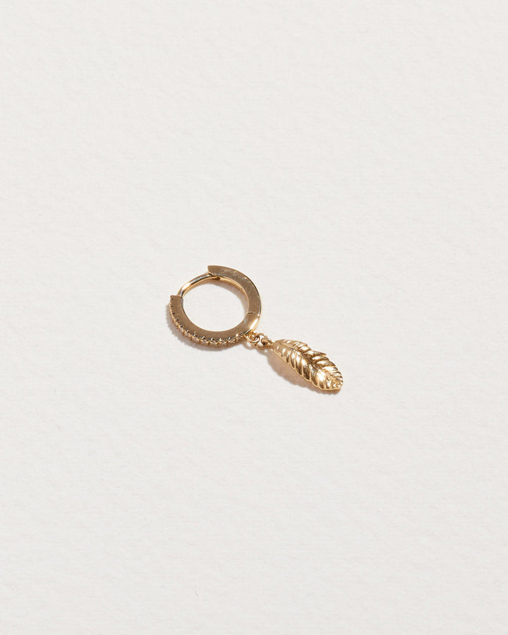 Handcrafted in 14k yellow gold with white diamonds. Feather charm: 9 x 4mm. Huggie outside diameter: 10.5mm, inside diameter: 7mm. Post length: 4.5mm. Clicker thickness: 0.95mm (19 gauge). Hinge mechanism, clicker closure. Sold as a single earring.