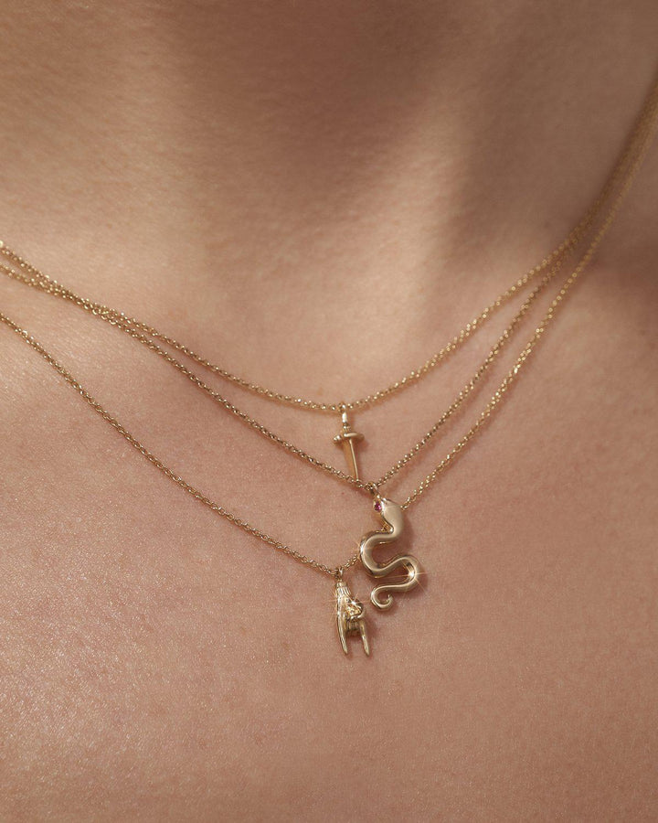 This Mano Cornuto Pendant by Pamela Love is a striking interpretation of the traditional Italian talisman, believed to ward off the evil eye or 'Malocchio.' The symbolic hand motif is crafted in solid 14k yellow gold and suspended from a delicate cable chain. A meaningful and elegant piece with protective charm.