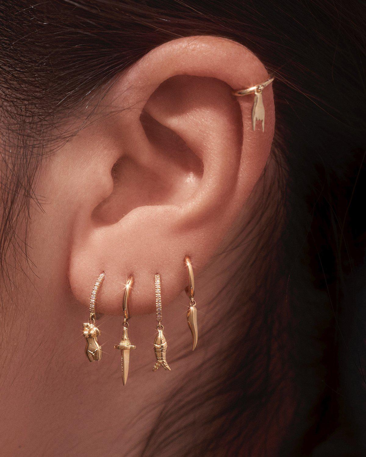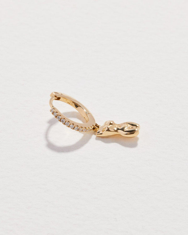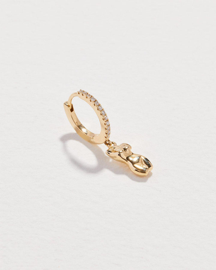This Torso Pavé Huggie by Pamela Love is inspired by the timeless beauty of Venus, the goddess of love and beauty. A sculptural gold torso charm, symbolizing femininity and grace, dangles from a pavé diamond huggie. This exquisite piece is designed for helix, lobe, and upper-lobe piercings, making it a unique addition to any jewelry collection.