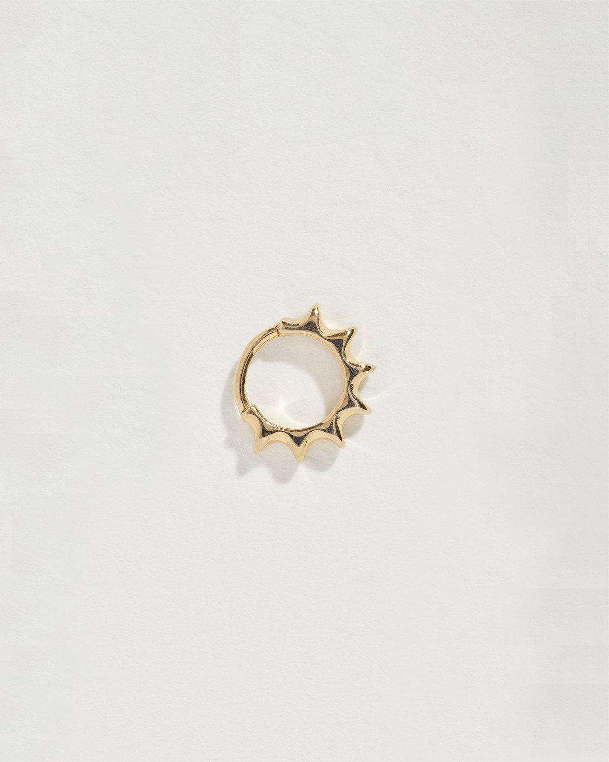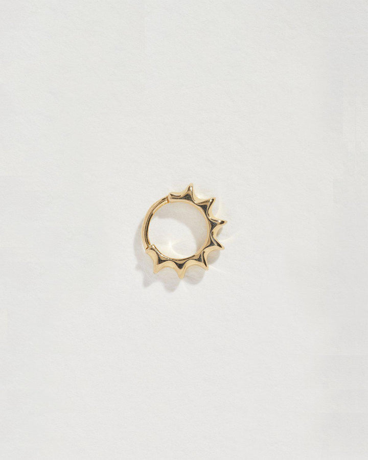 This Sun Huggie by Pamela Love is a luminous, golden hoop inspired by the brand’s beloved Sun Hoops. Designed for effortless everyday wear, its sculptural silhouette adds a warm radiance to any ear stack. Perfect for lobe, rook, and upper-lobe piercings.