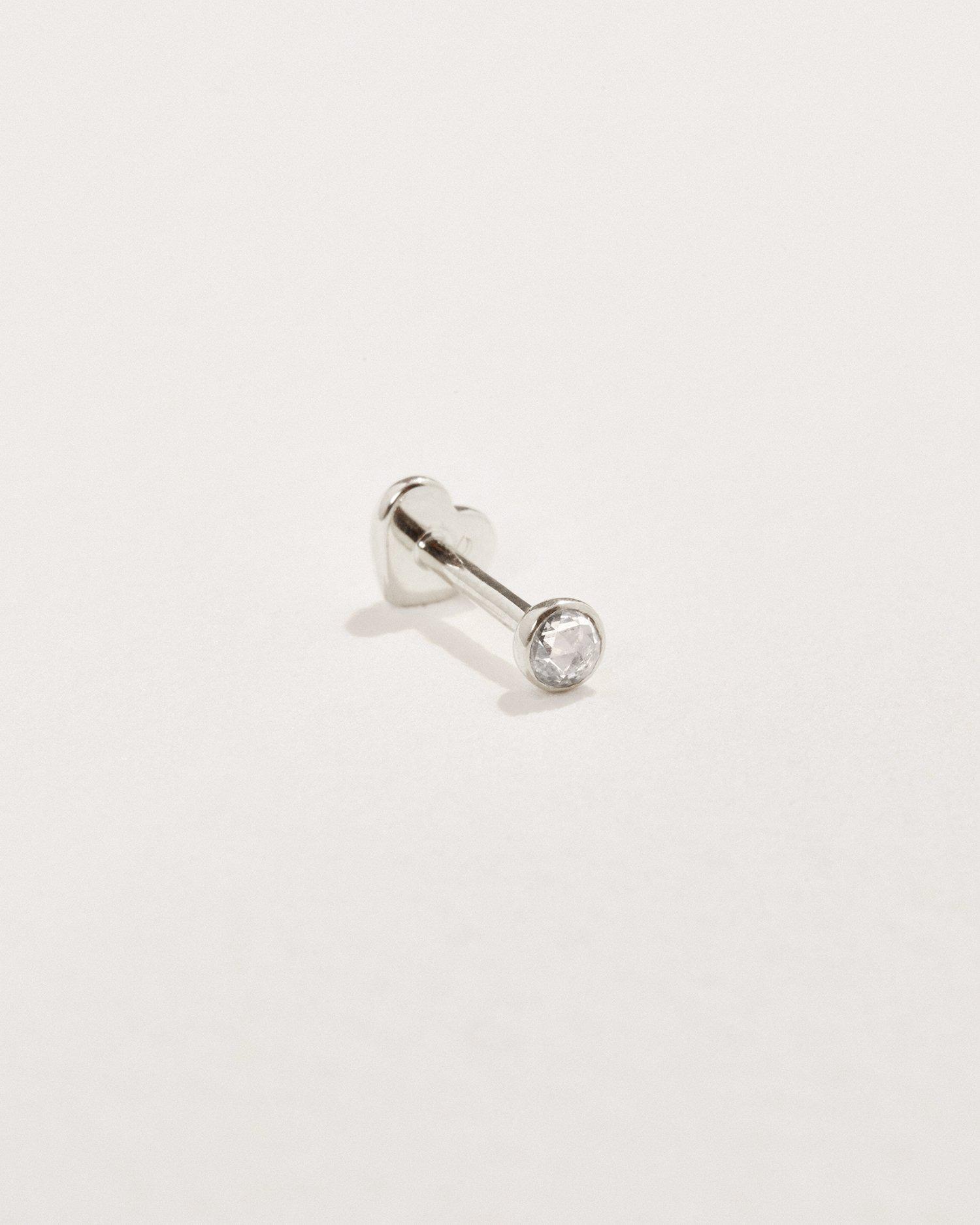 Handcrafted in 14k white gold with a white diamond. Stud size: 2.5mm. Threading: 19 gauge (0.95mm) width. Post length: 6.5mm. Threaded heart-shaped ball back closure. Sold as a single earring.