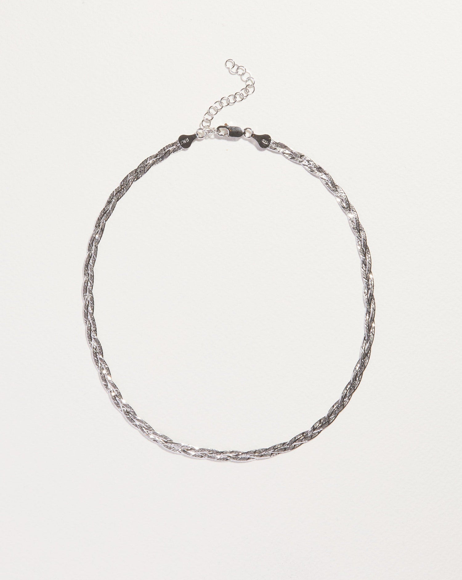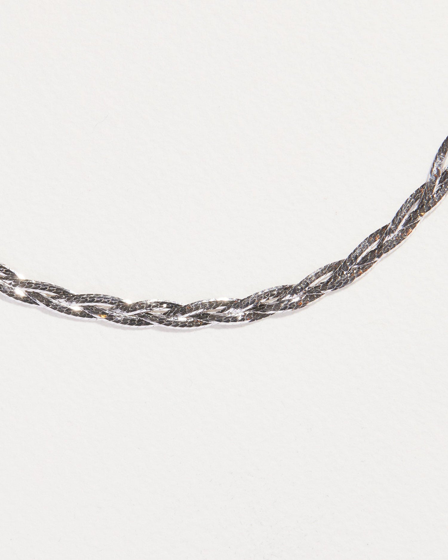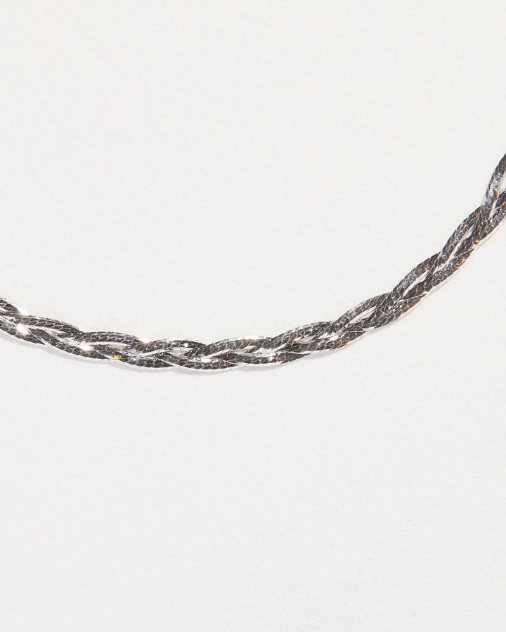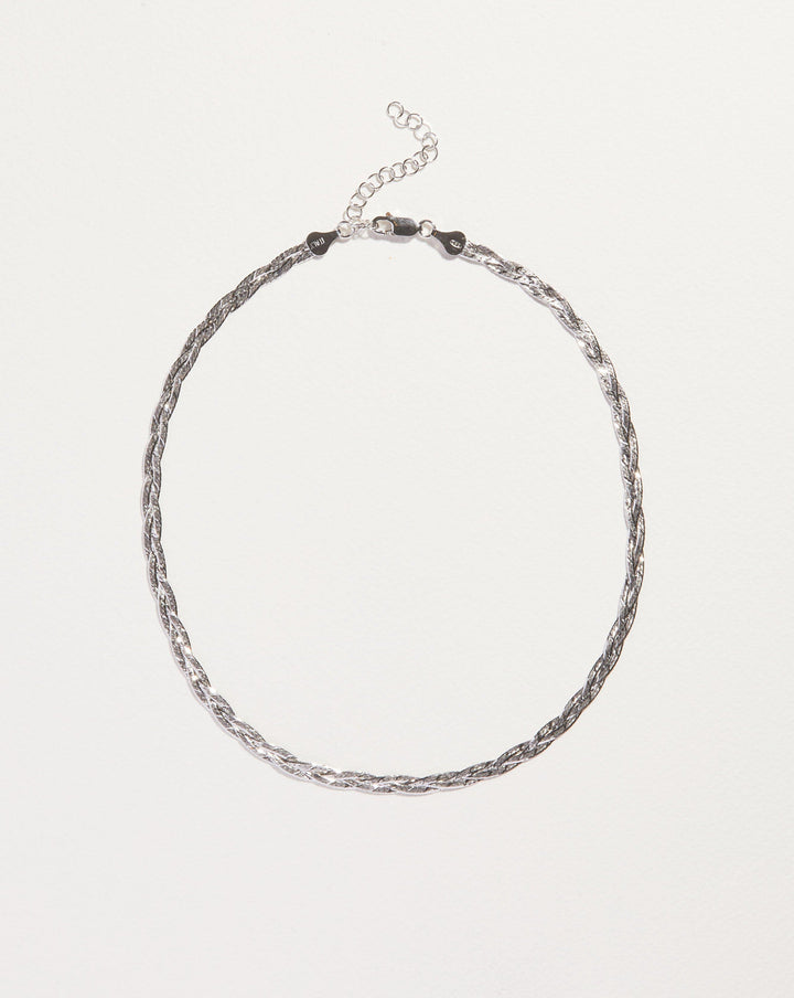 This Braided Herringbone Thin Chain by Pamela Love is a delicate, silver interpretation of the classic woven chain, handcrafted in Italy for a refined, textural look. It drapes gracefully along the collarbone, offering an understated yet sophisticated aesthetic. The reversible design, with one high-polish side and one matte side, provides effortless versatility for any occasion.