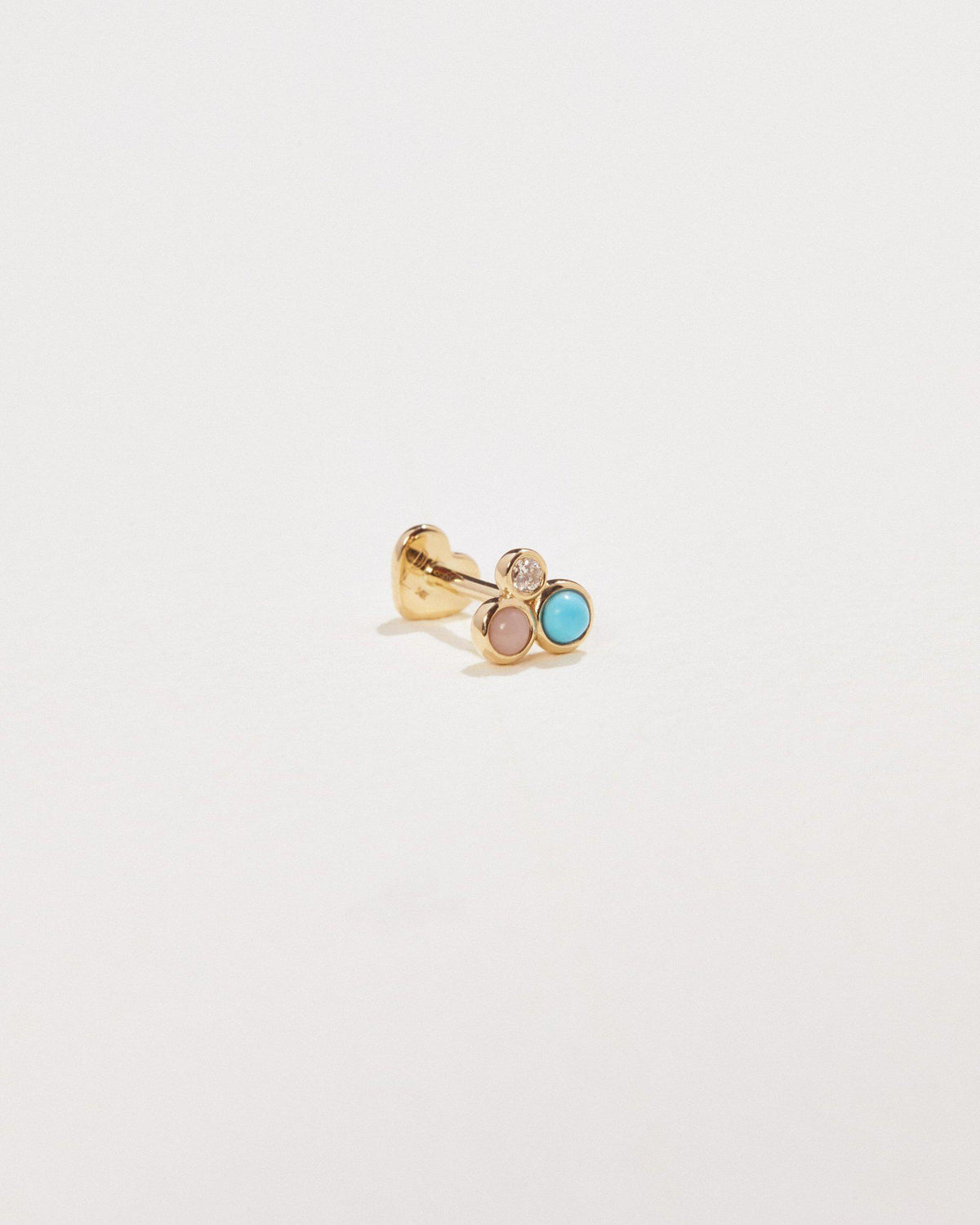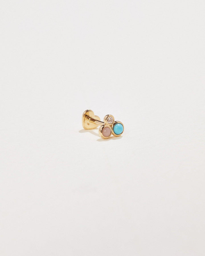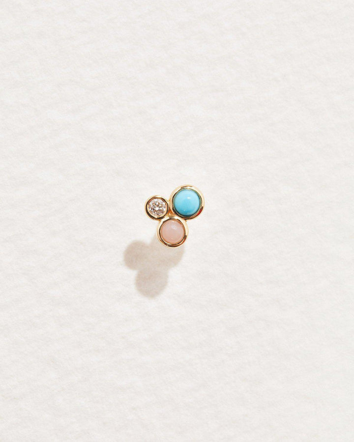 This Bezel Set Trio Stud by Pamela Love showcases a harmonious blend of three vibrant stones—creamy pink opal, striking turquoise, and a brilliant white diamond. Playful yet elegant, this stud brings a refined pop of color to any ear stack. Its compact size and secure threaded back make it ideal for various piercings, including the helix, lobe, tragus, and nose. Sold as a single earring.