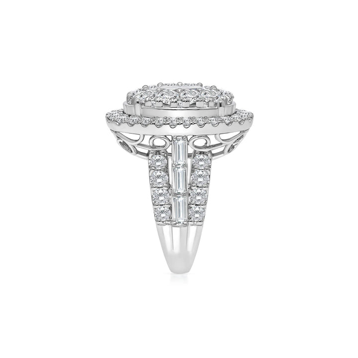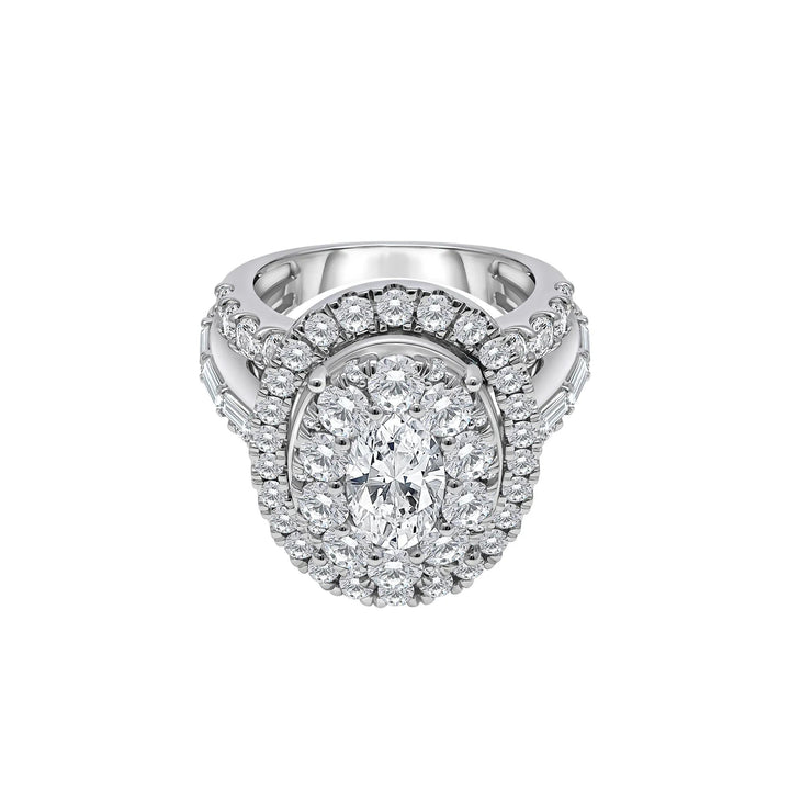 This 5 CT. Tw. Lab Grown Diamond Composite Ring by Helzberg Diamonds provides a grand and opulent presence, perfect for the most meaningful proposal. The central oval lab-grown diamond is surrounded by 62 round brilliant and 6 baguette diamonds, creating a voluminous halo of light that totals an impressive 5 carats. This ring’s architectural lines and bright white gold setting create a look of timeless glamour and modern refinement. Symbolizing the strength and clarity of your devotion, this exquisite piece is a radiant heirloom. It is the perfect choice for an engagement that demands elegance, poise, and a lifetime of eco-conscious, sophisticated sparkle.