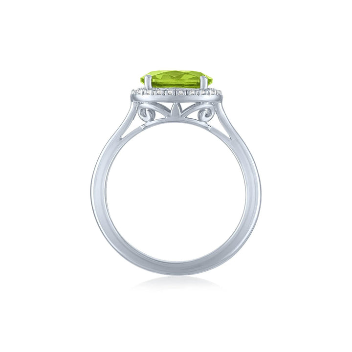This .925 sterling silver ring showcases a 9x7mm oval natural peridot and 22 round single-cut diamonds in a size 7.5 with a 1mm band.