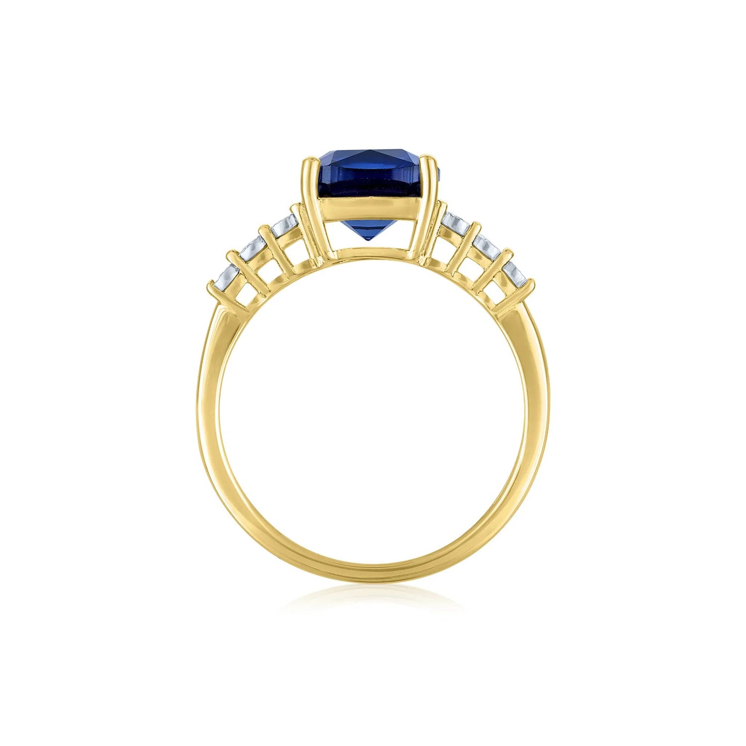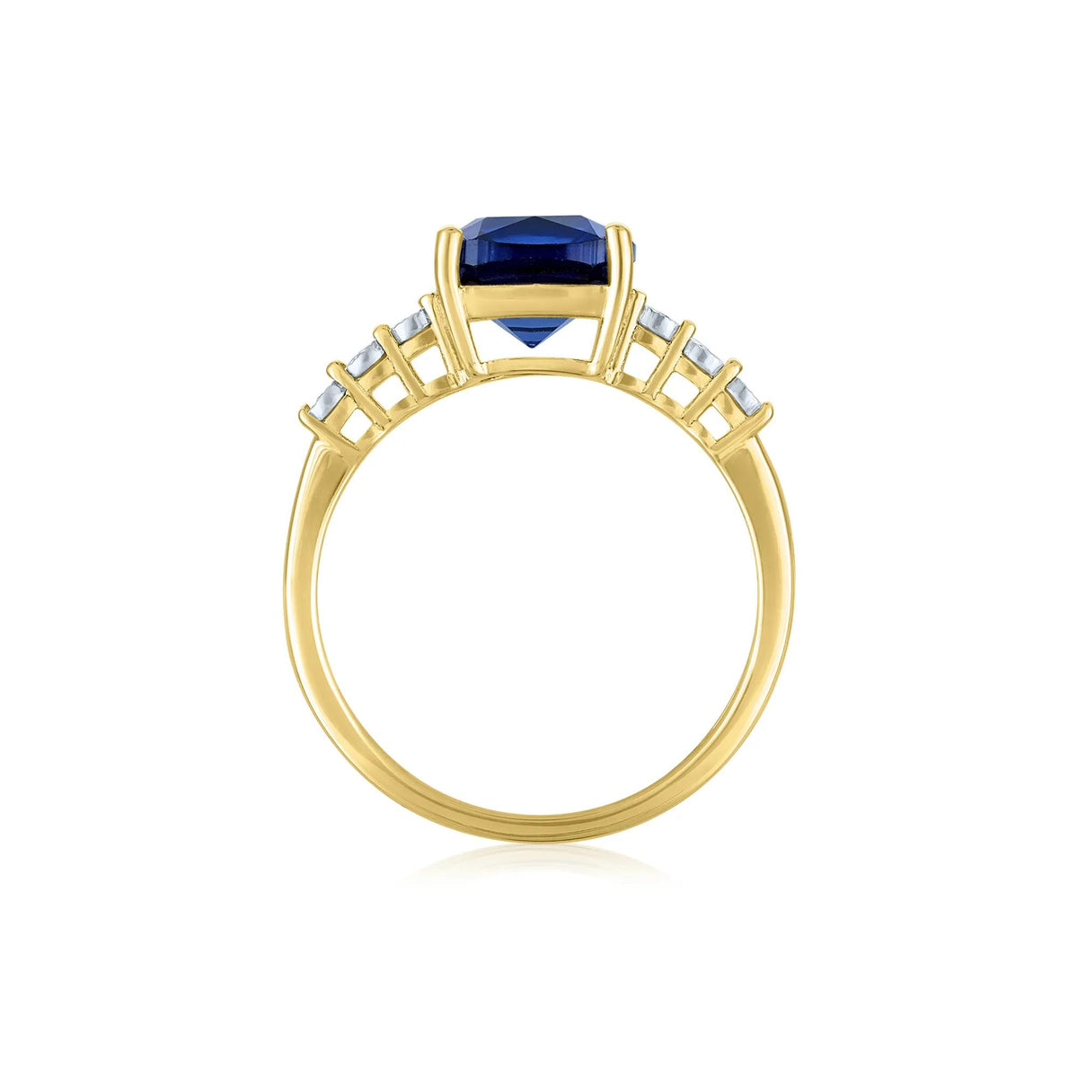 This size 8.5 ring is crafted in 10K yellow gold and features an 8mm lab-created blue sapphire and 6 diamond accents.