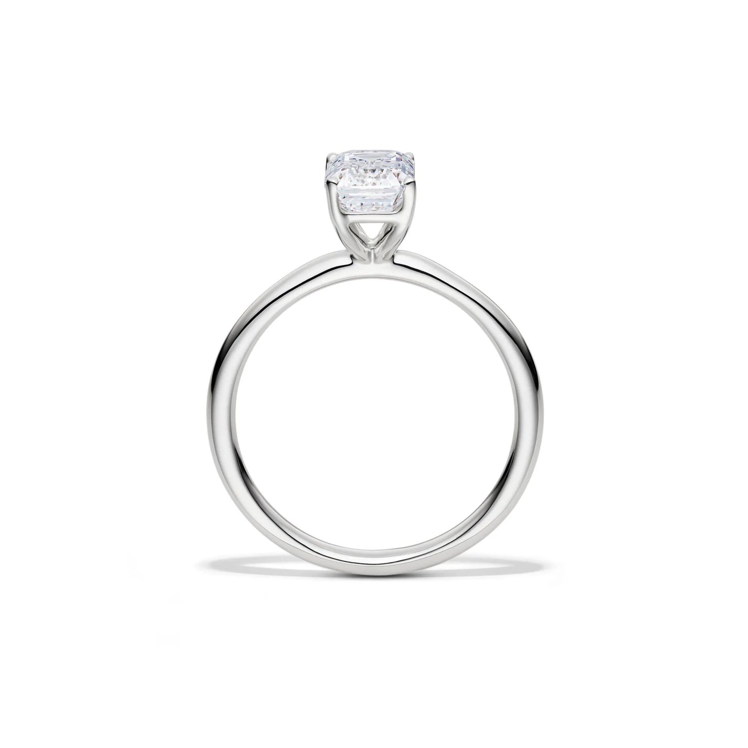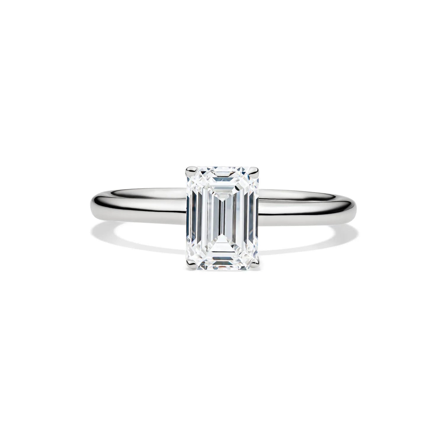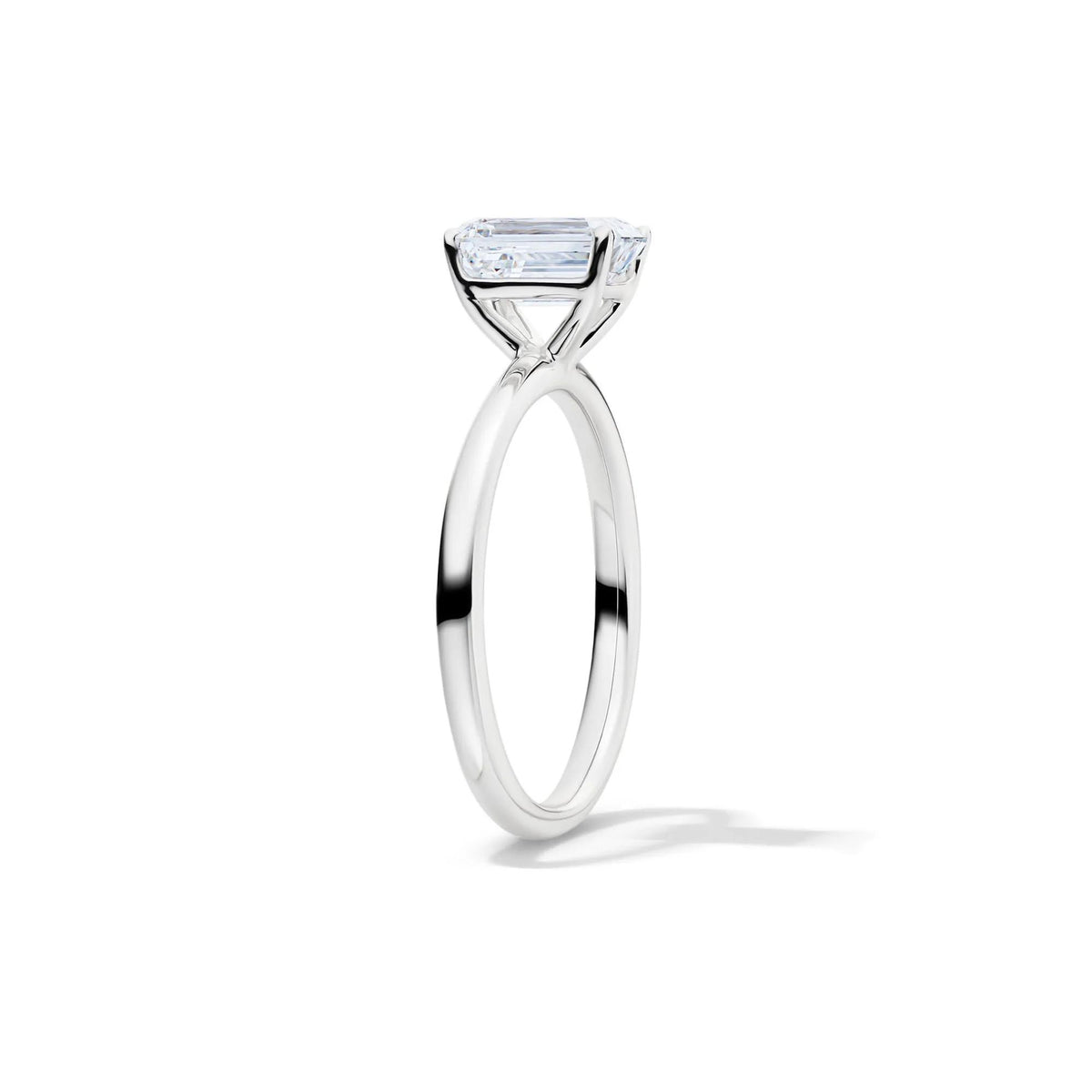 Handcrafted in 14K white gold, this GCAL-certified ring features a 1 1/2 ct. emerald-cut lab grown diamond solitaire in a 2mm size 5 band.