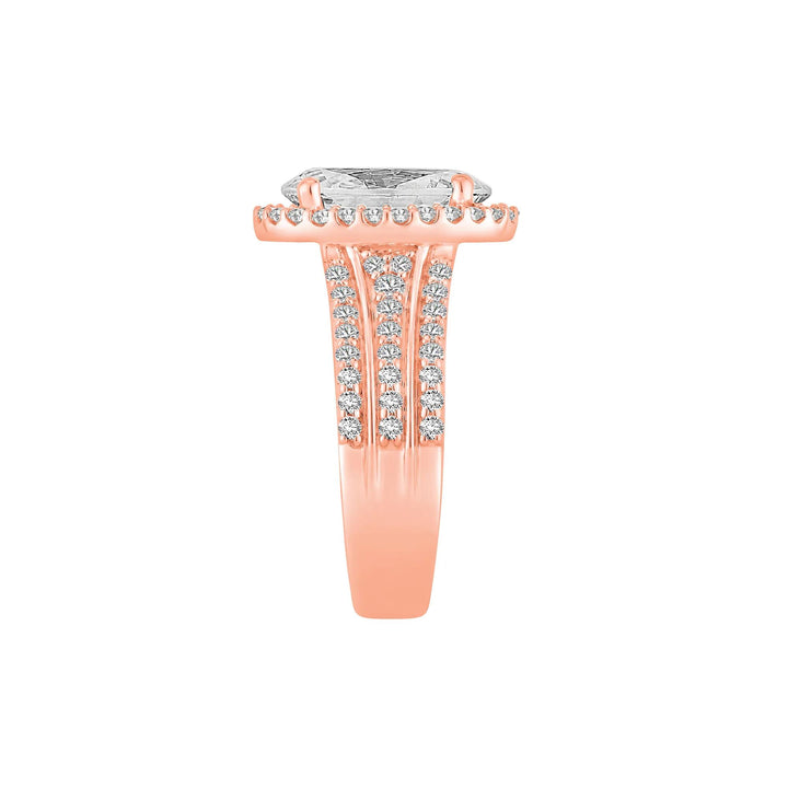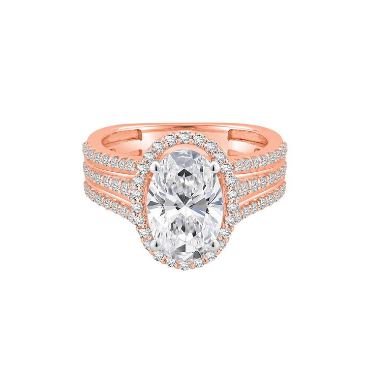 Crafted in 14K rose and white gold with lab grown diamonds totaling 4 1/4 carats. Features a 3.5 carat GCAL certified oval brilliant center diamond and 76 lab grown round accent diamonds totaling 3/4 carat. Band width is 7mm. Ring size 5.5.