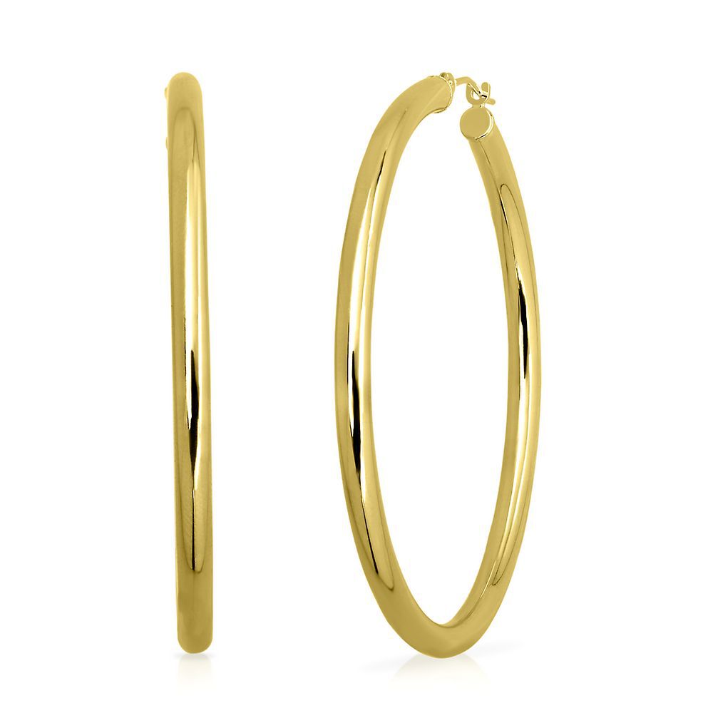 Handcrafted in 14K yellow gold with a hypo-allergenic nickel-free alloy. Diameter measures 50 millimeters. Secure clasp included.