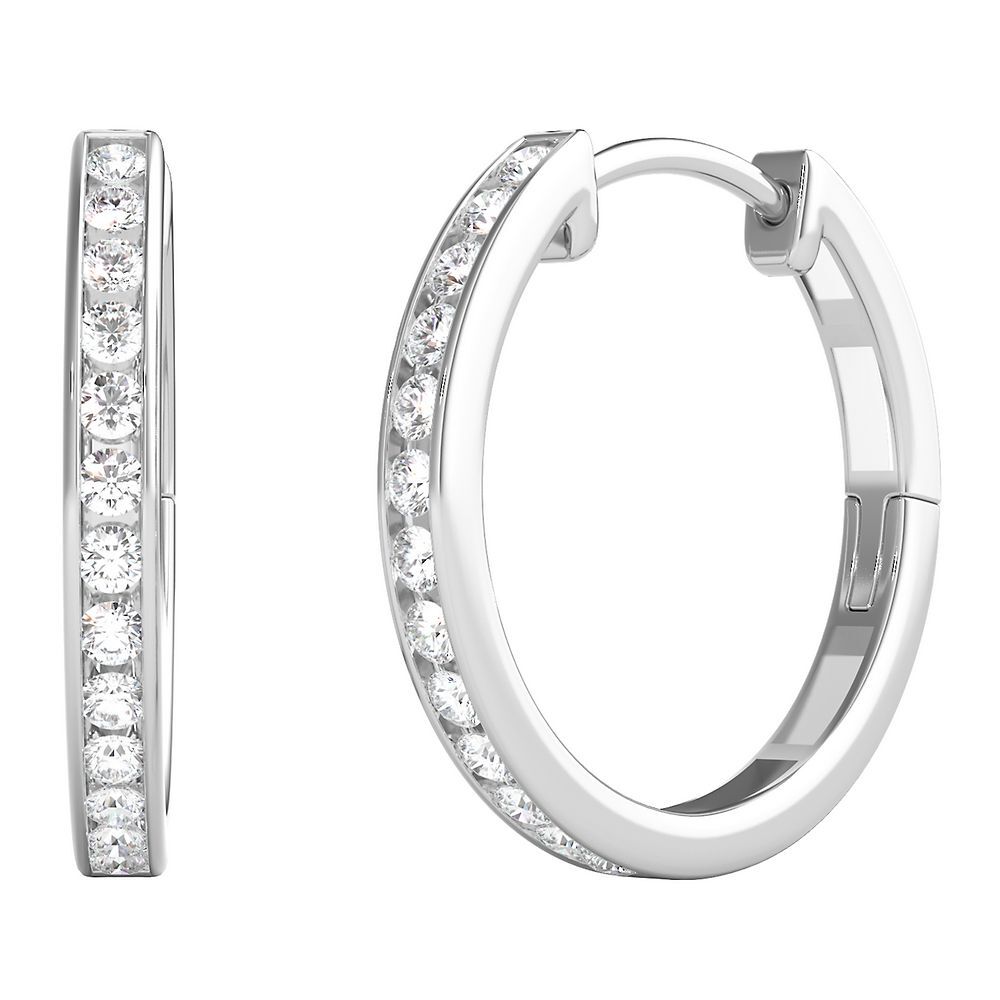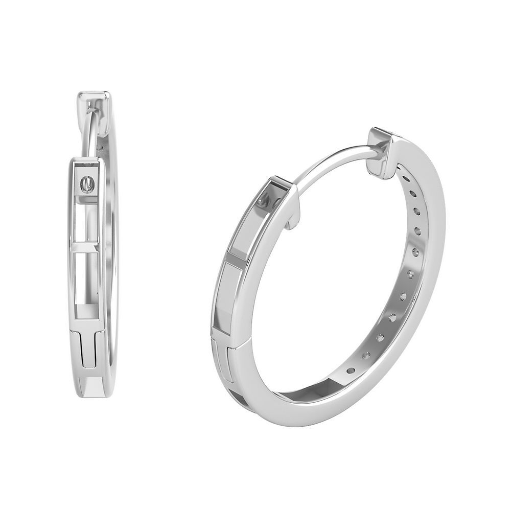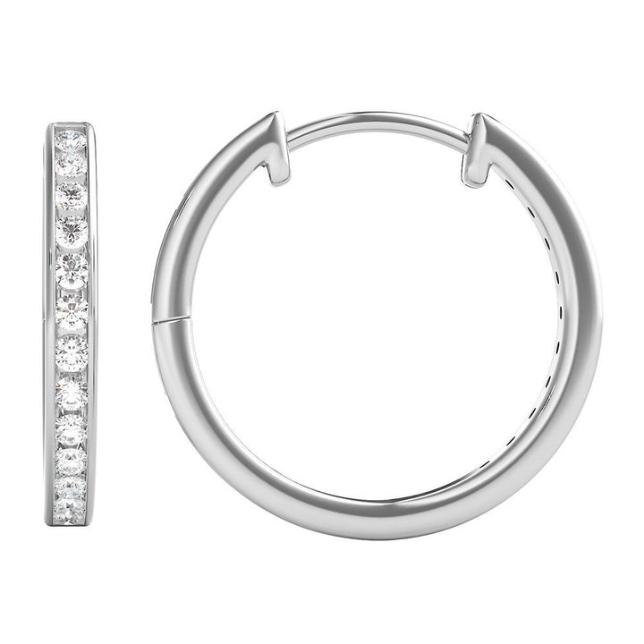 These 1/4 ct. tw. Diamond Hoop Earrings by Helzberg in 10K White Gold showcase 26 round brilliant cut diamonds totaling approx. 1/4 carat total weight. The 18mm hoops offer radiant sparkle and classic elegance for versatile wear.
