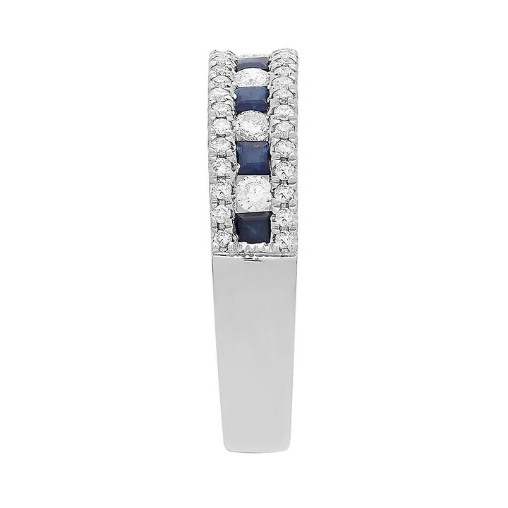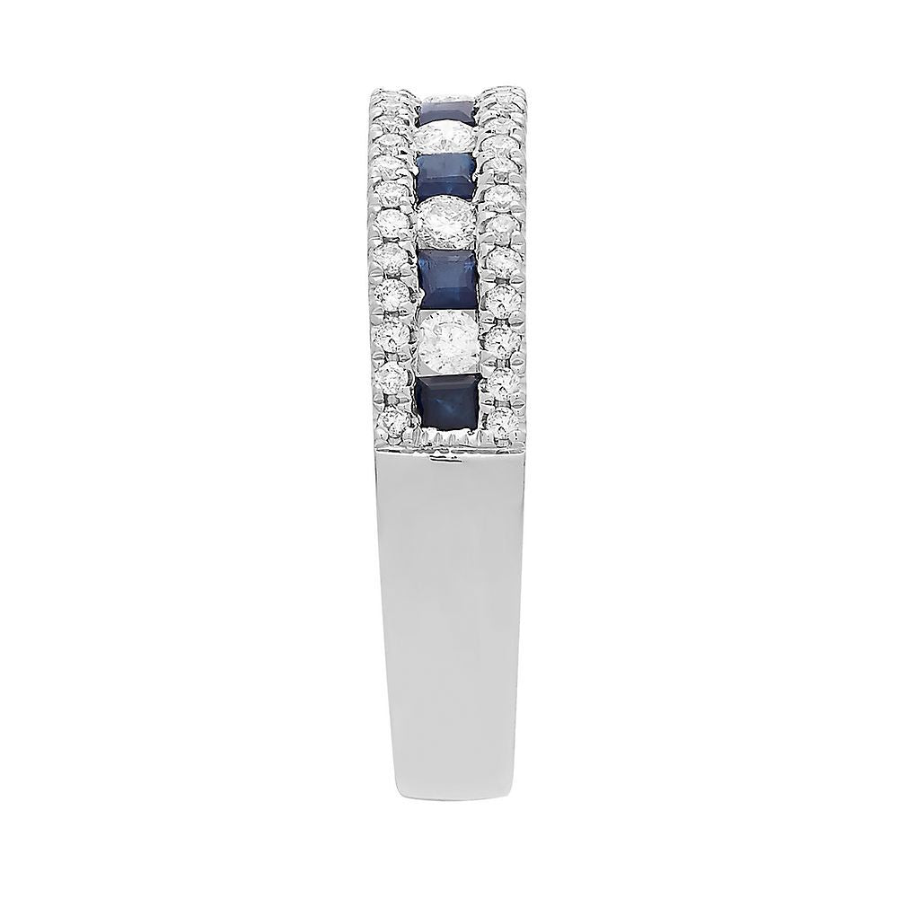 This Sapphire & 1/3 ct. tw. Diamond Band by Helzberg showcases seven 2mm square blue sapphires paired with six round brilliant cut diamonds totaling approximately 1/5 ct. tw. and 46 round single cut diamonds totaling approximately 1/5 ct. tw. Set in 10K white gold, the band balances color and sparkle beautifully.