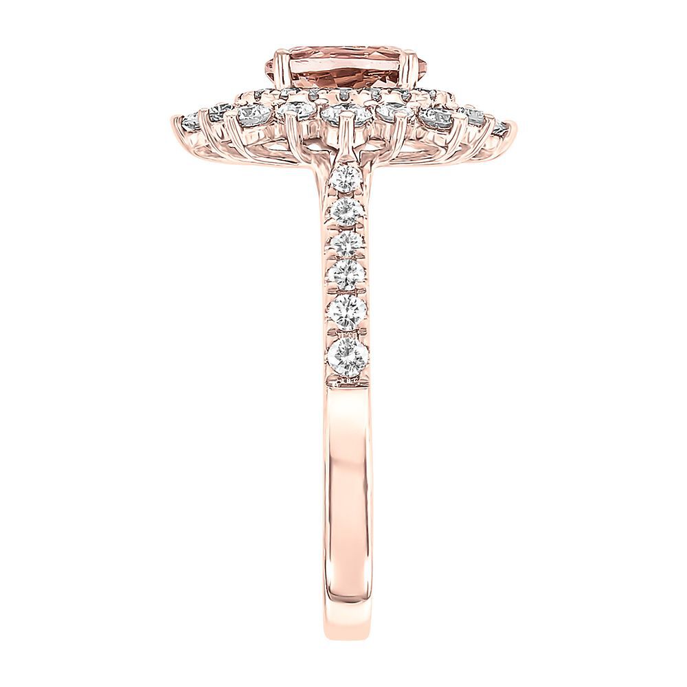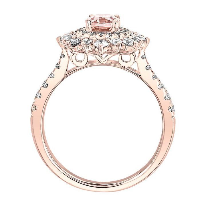 This Morganite & 3/4 ct. tw. Diamond Ring by Helzberg is a stunning display of feminine grace and sparkle. Set in 14K rose gold, it features a 7x5mm oval-shaped morganite surrounded by forty-eight round brilliant cut diamonds totaling approximately 3/4 carat total weight, creating a captivating halo effect.