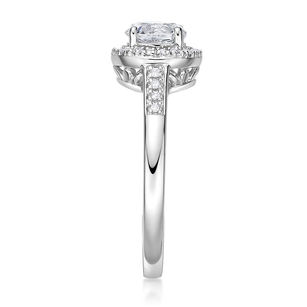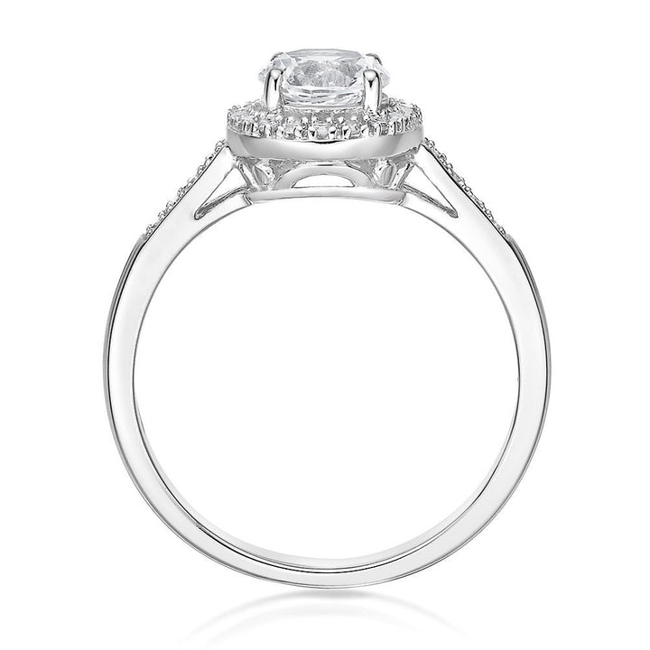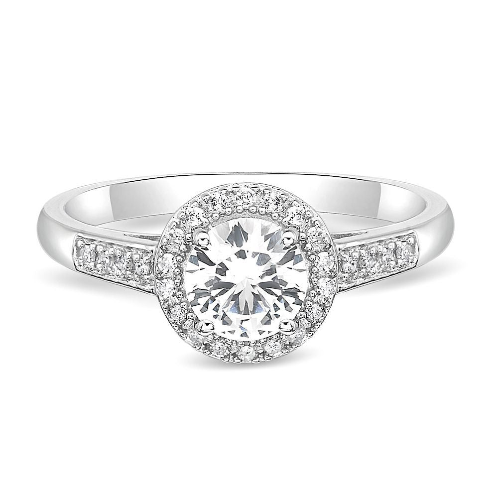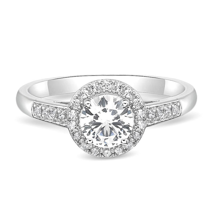 This Lab Created White Sapphire & 1/8 ct. tw. Diamond Ring by Helzberg embodies timeless sophistication. The sterling silver ring showcases a 6mm round lab-created white sapphire surrounded by twenty-six round single cut diamonds totaling approximately 1/8 carat total weight, combining purity and brilliance.