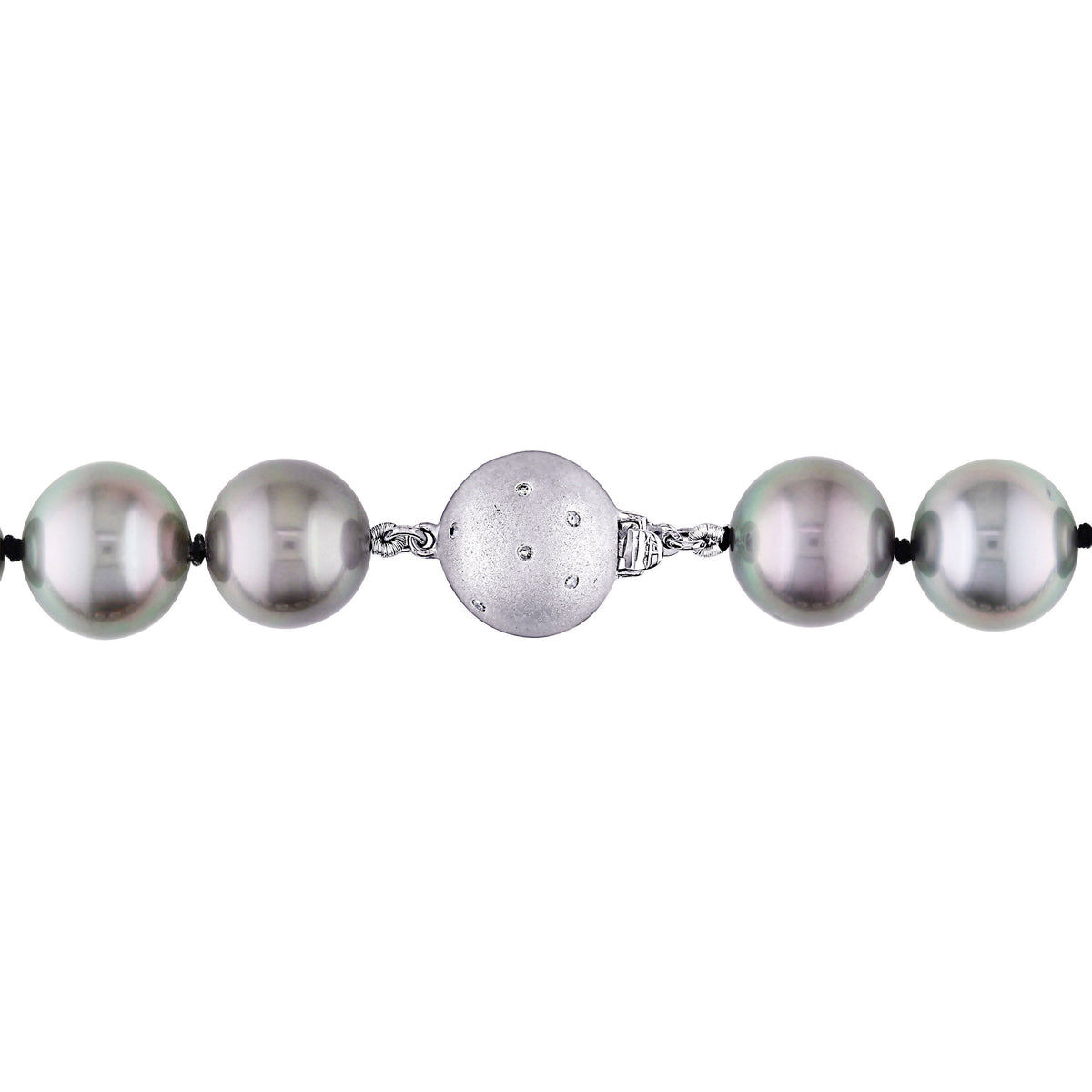 Made with 28 black cultured Tahitian pearls (10-13mm) featuring natural iridescence. Secured with a 14K white gold clasp. Necklace length 18 inches.