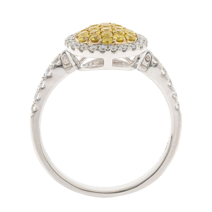 Made in 14K white gold, featuring 27 brilliant cut yellow diamonds and 39 brilliant cut white diamonds. Total carat weight approximately 7/8 carat. Ring size [insert size].
