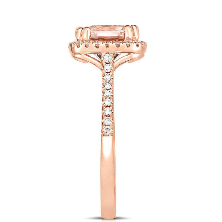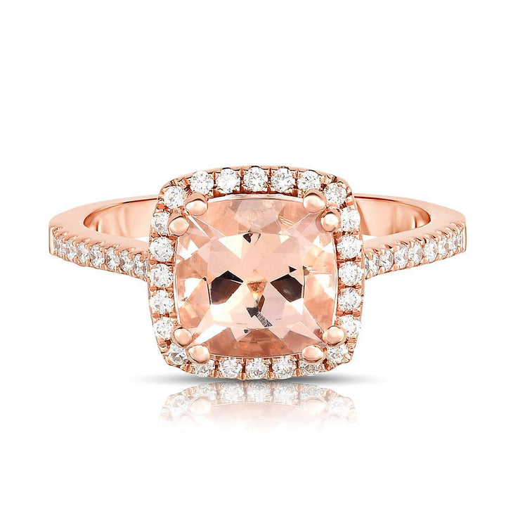 Made in 14K rose gold with one 8x8mm cushion cut morganite and 42 round brilliant cut diamonds totaling 1/4 carat. Ring size [insert size].