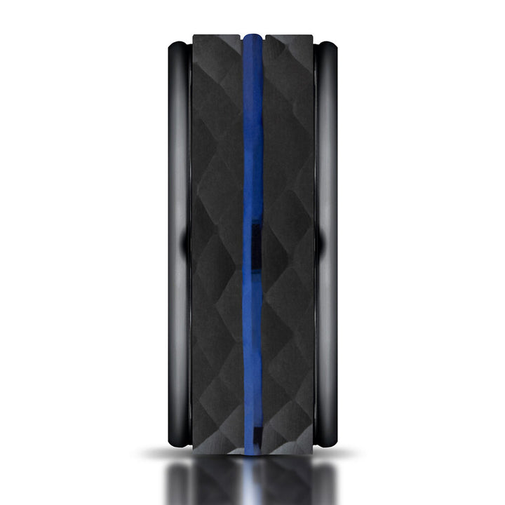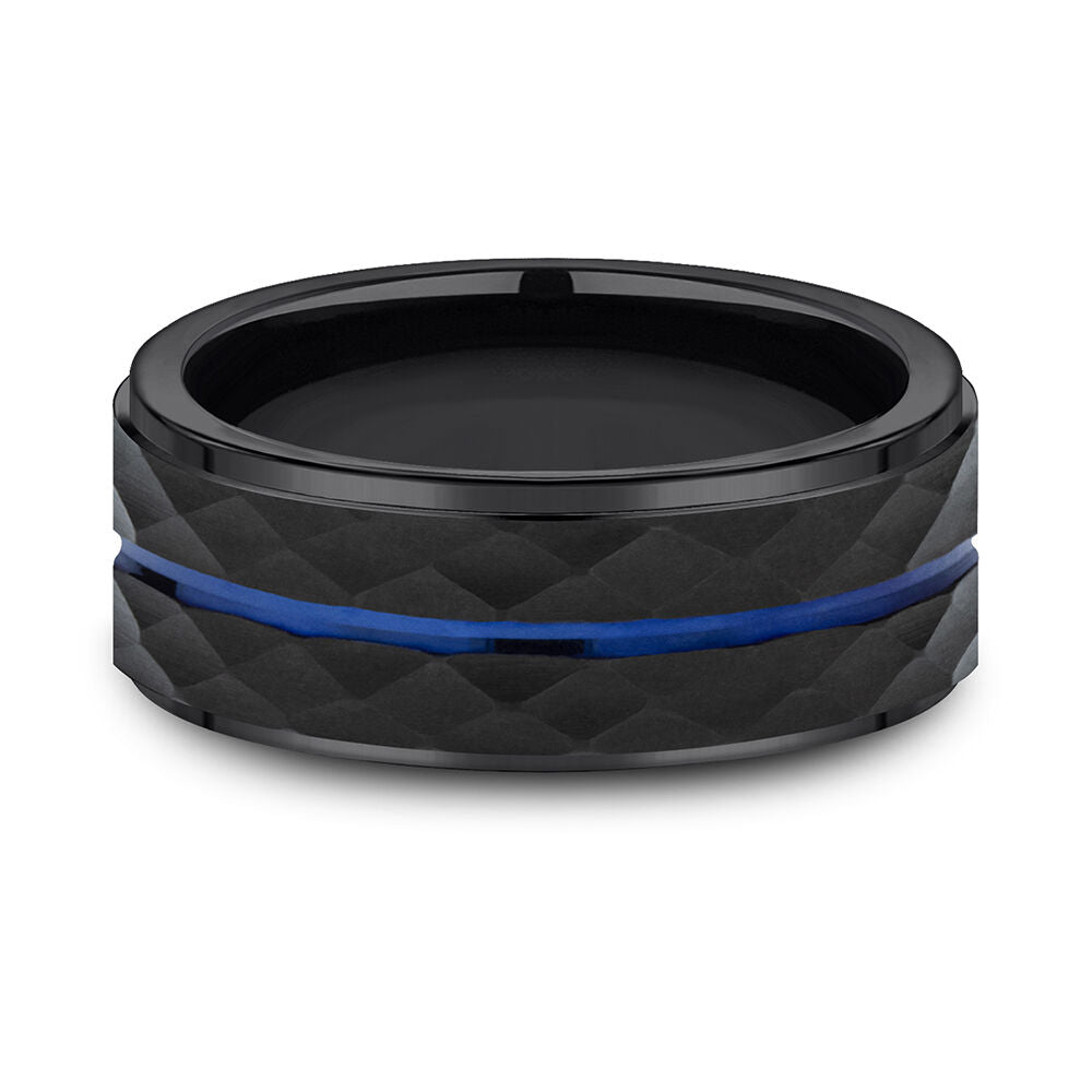 Made of black and blue cobalt alloy, 8mm width. Durable, scratch resistant, with comfort fit interior. Ring size [insert size].