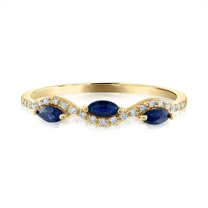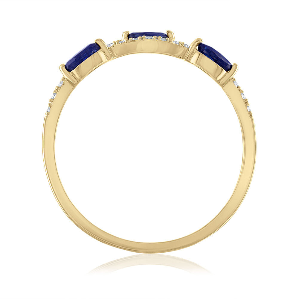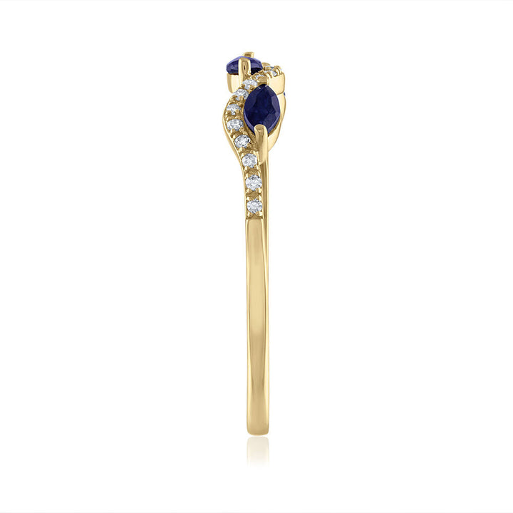 This Gemstone and Diamond Accent Ring by Helzberg showcases exquisite style with 21 round single cut diamonds swirling around three brilliant cut marquise-shaped gemstones. Set in 14K gold, it offers delicate artistry and refined sparkle for any occasion.