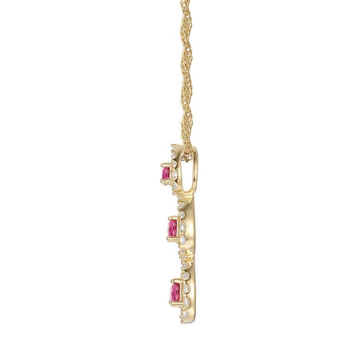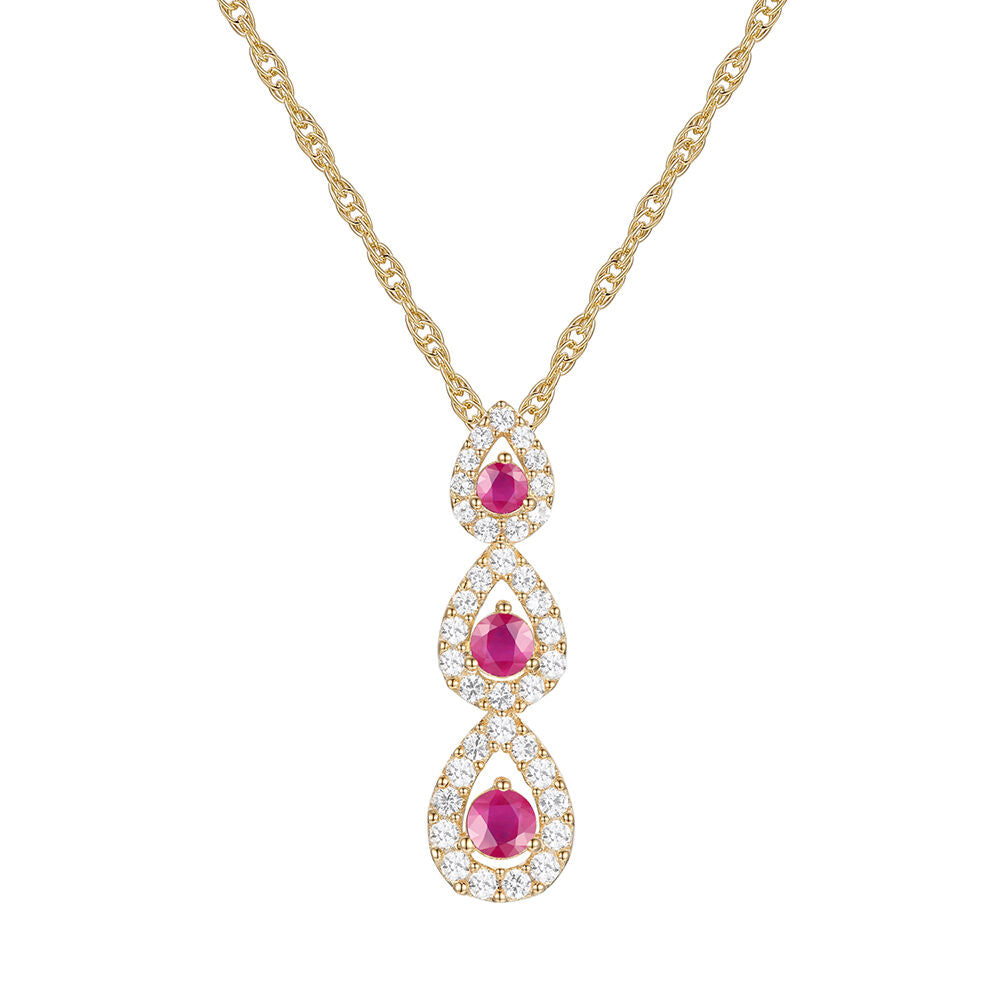 This Ruby and Diamond Drop Pendant by Helzberg exudes elegance with three pear-shaped diamond halos, holding a central round ruby gemstone in a 10K yellow gold setting. Celebrating the passionate July birthstone, this pendant conveys wisdom and timeless beauty with every wear.