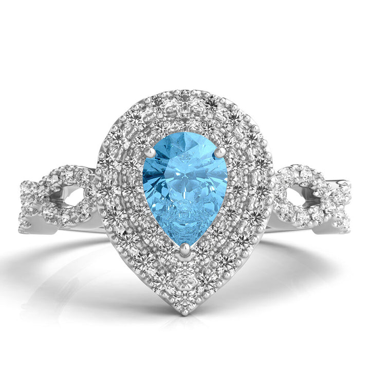 Crafted in sterling silver featuring one pear-shaped blue topaz, accented by round lab-created white sapphires arranged in a double halo setting.