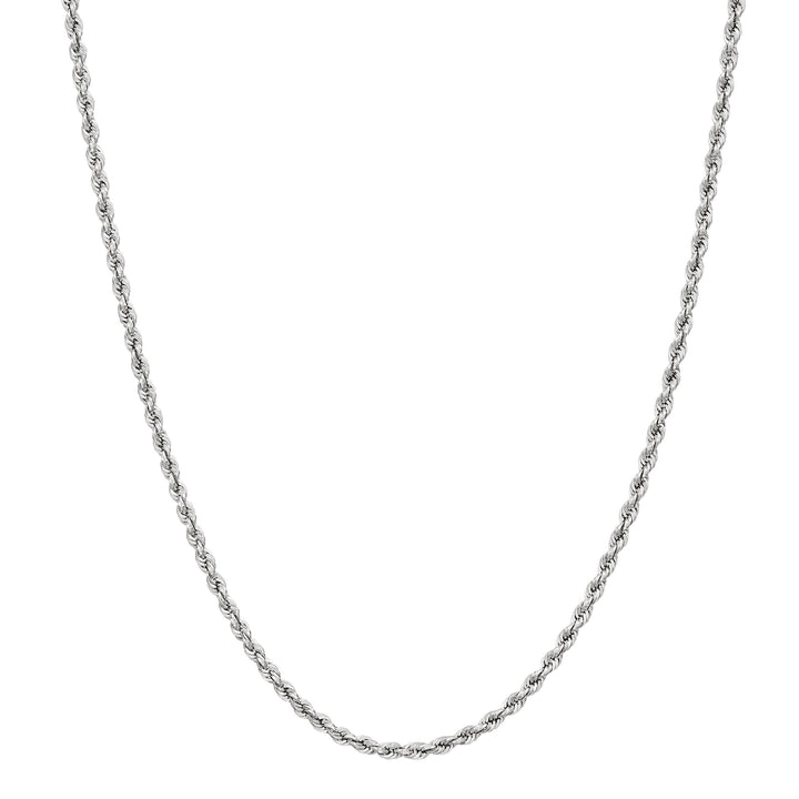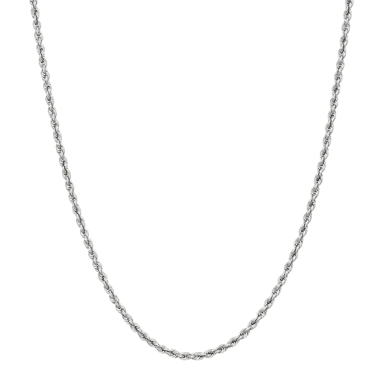 Crafted in 14K white gold, measuring 2mm width and 20 inches length. Polished glitter rope chain design with secure clasp.