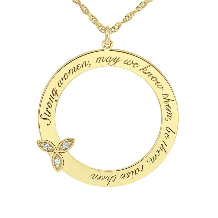 Made in 10K yellow gold with a diamond accent on engraved circle pendant. Adjustable chain length 16'–18' with secure clasp.