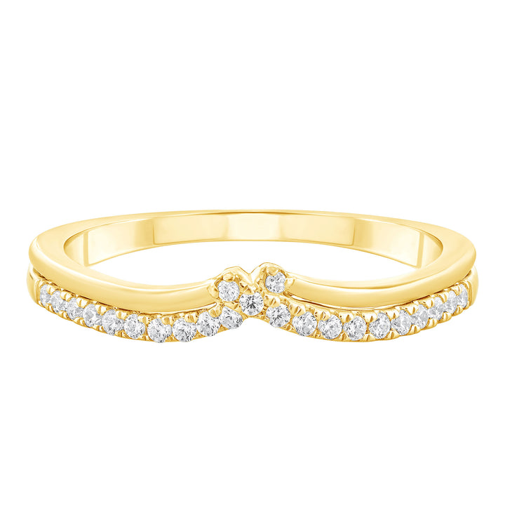 Made in 10K yellow gold with 23 round brilliant cut diamonds totaling approximately 0.125 carats. Contoured polished band designed to complement engagement rings.