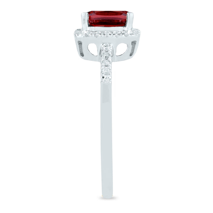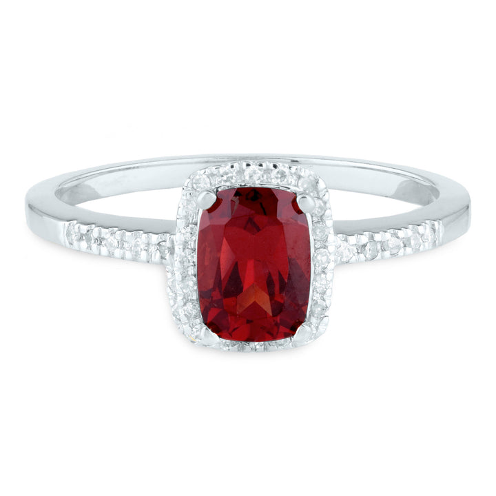 Crafted in 10K white gold featuring one 7x5 mm cushion-shaped garnet and 30 round single cut diamonds totaling 0.10 carats. Polished band with secure setting.