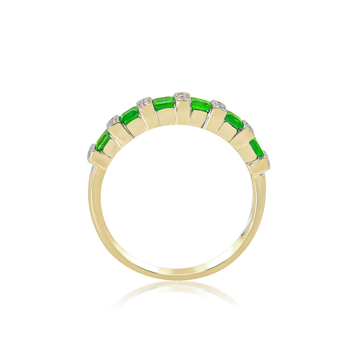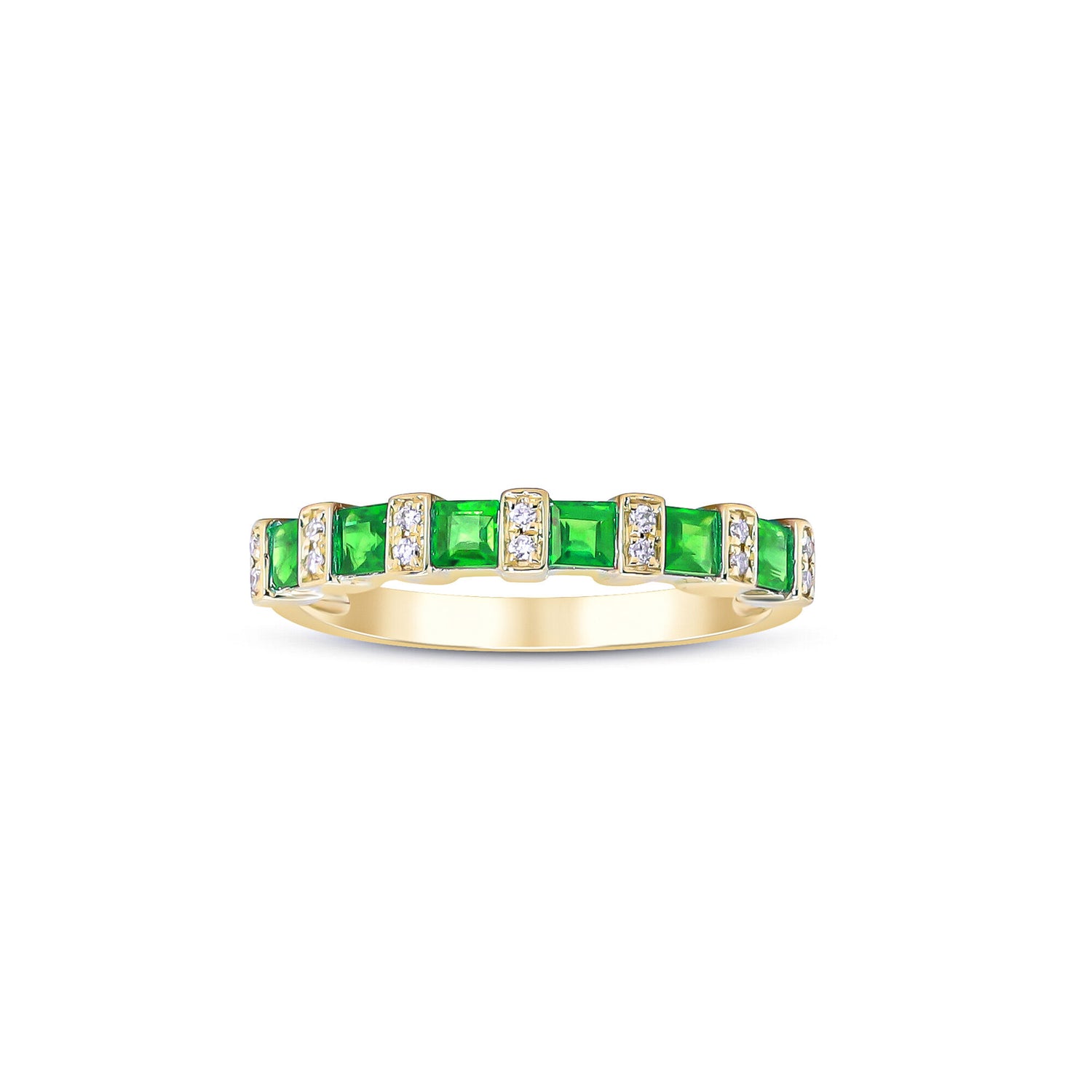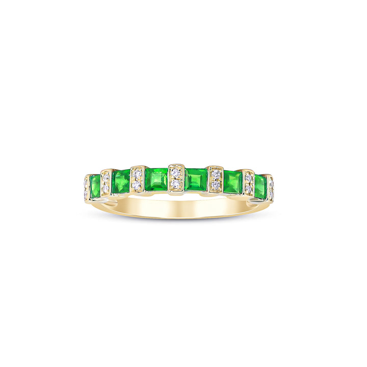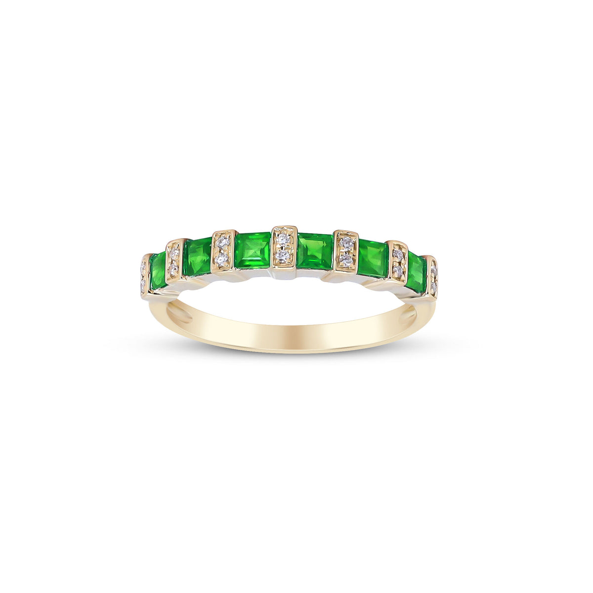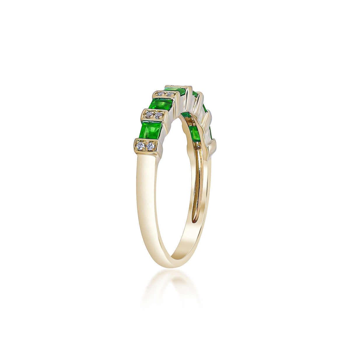 Made in 10K yellow gold with six princess-cut emeralds and 14 round brilliant cut diamonds. Ring band polished with secure setting; dimensions vary by size.