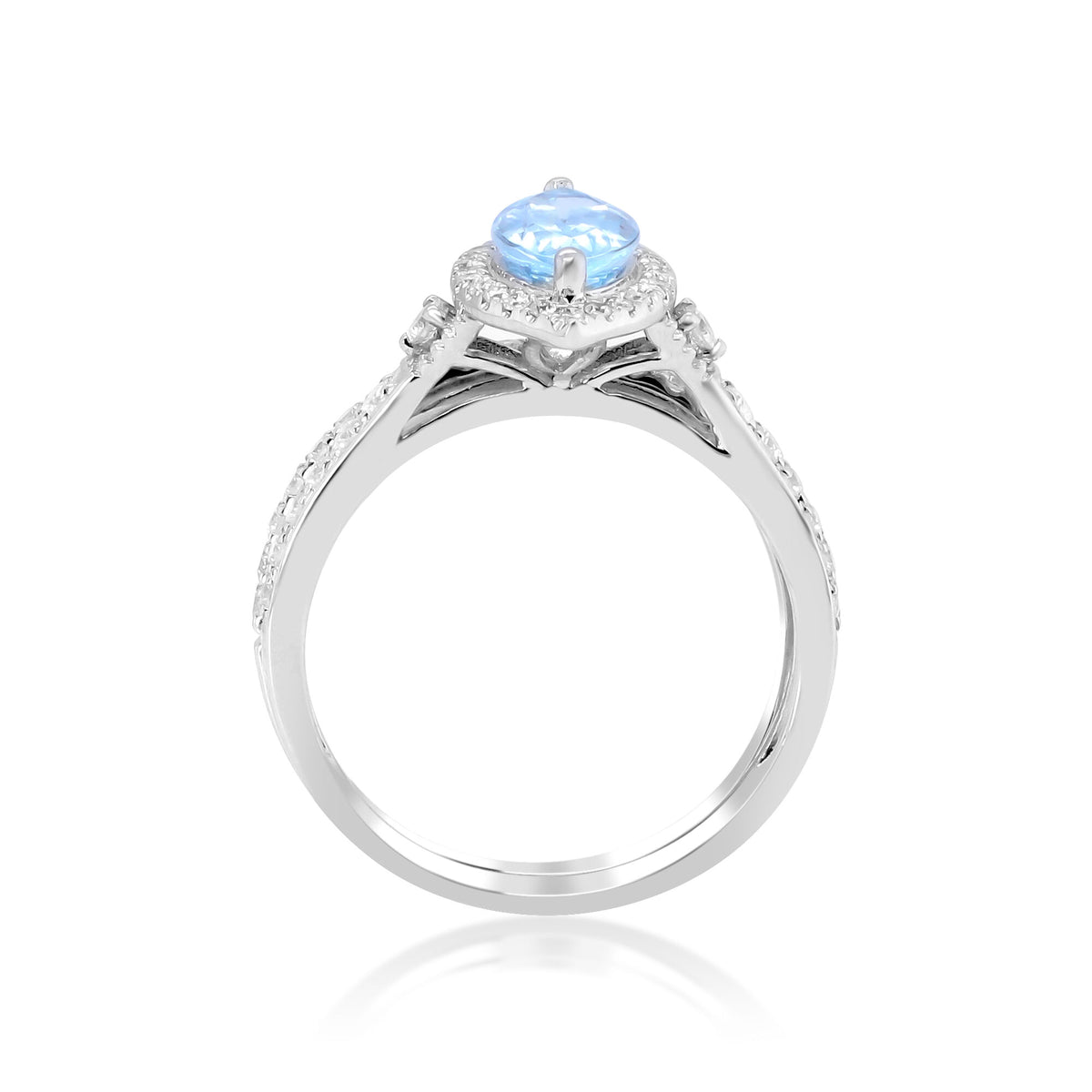 Made in 14K white gold, featuring one marquise-cut aquamarine and 59 round brilliant cut diamonds totaling 0.5 carats. Ring band polished with a gallery adorned by diamond accents.