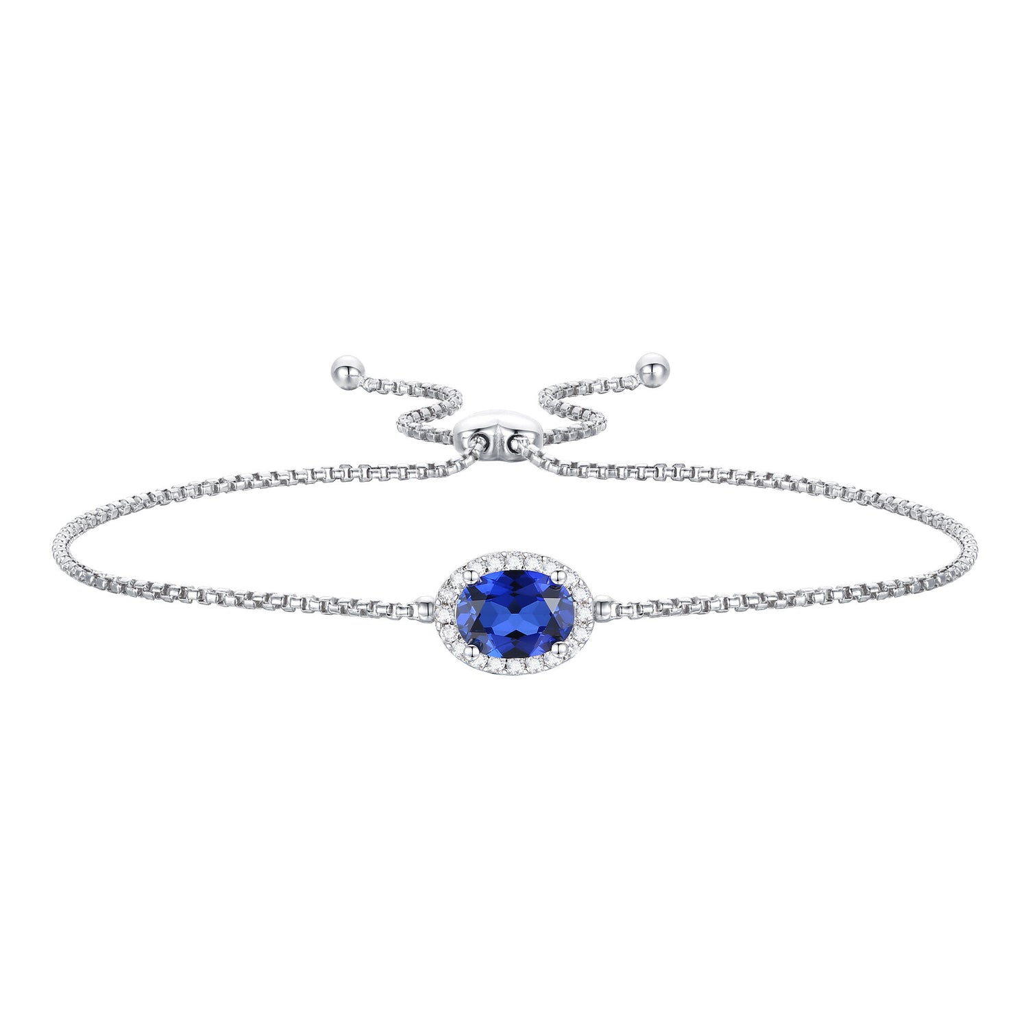 Crafted in sterling silver with one oval lab-created blue sapphire and 20 lab-created white sapphires. Adjustable bolo bracelet; length not specified.