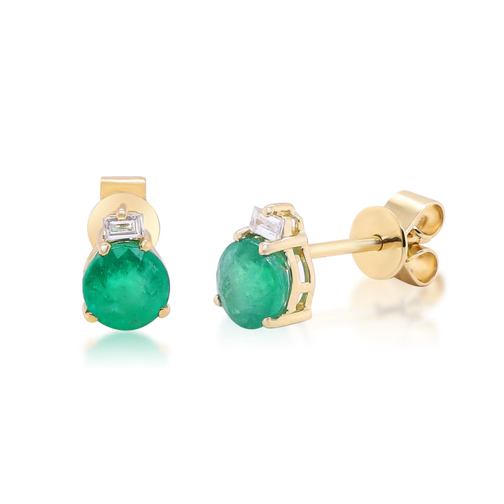 Handcrafted in 14K yellow gold, set with two round emeralds and two baguette diamonds. Stud earring design.