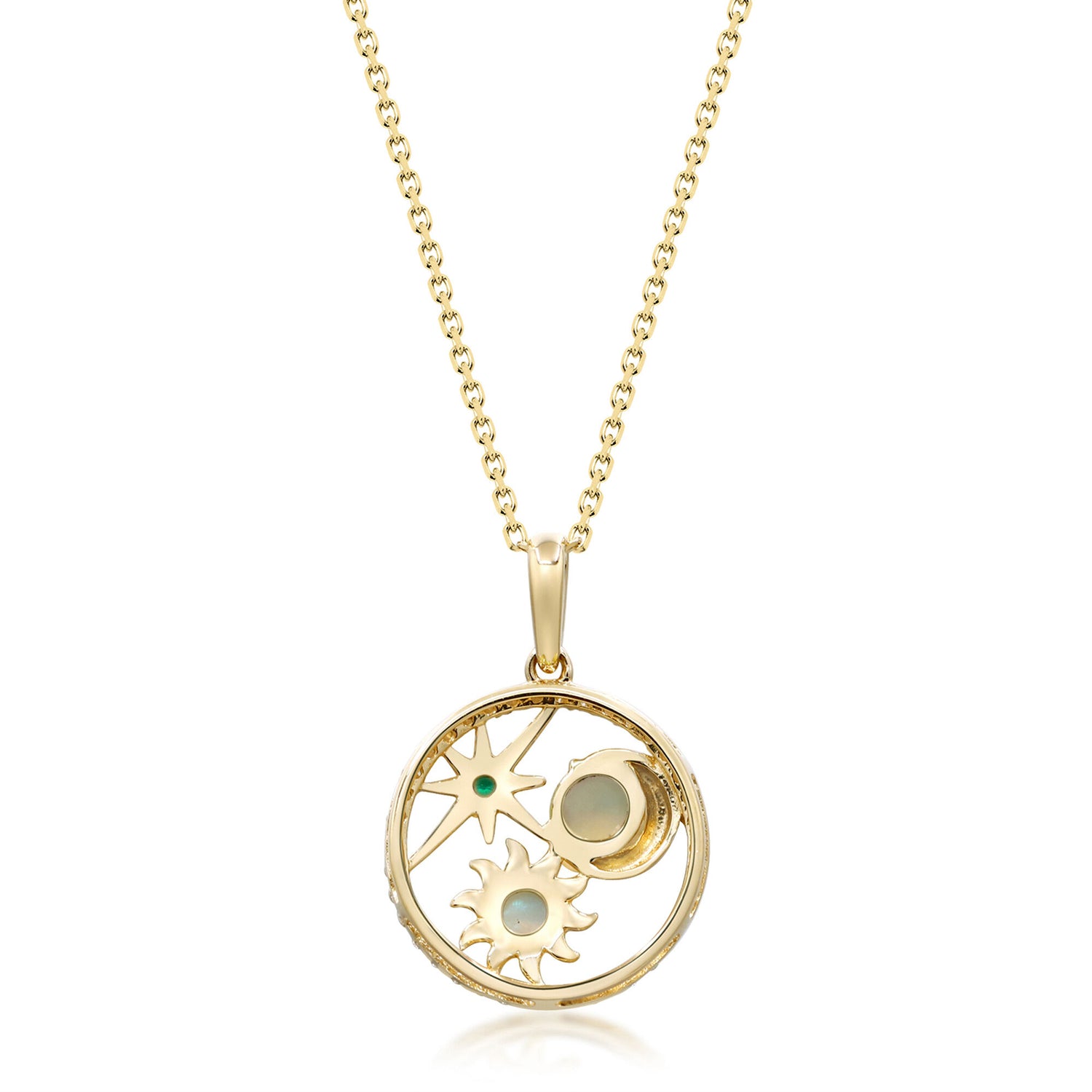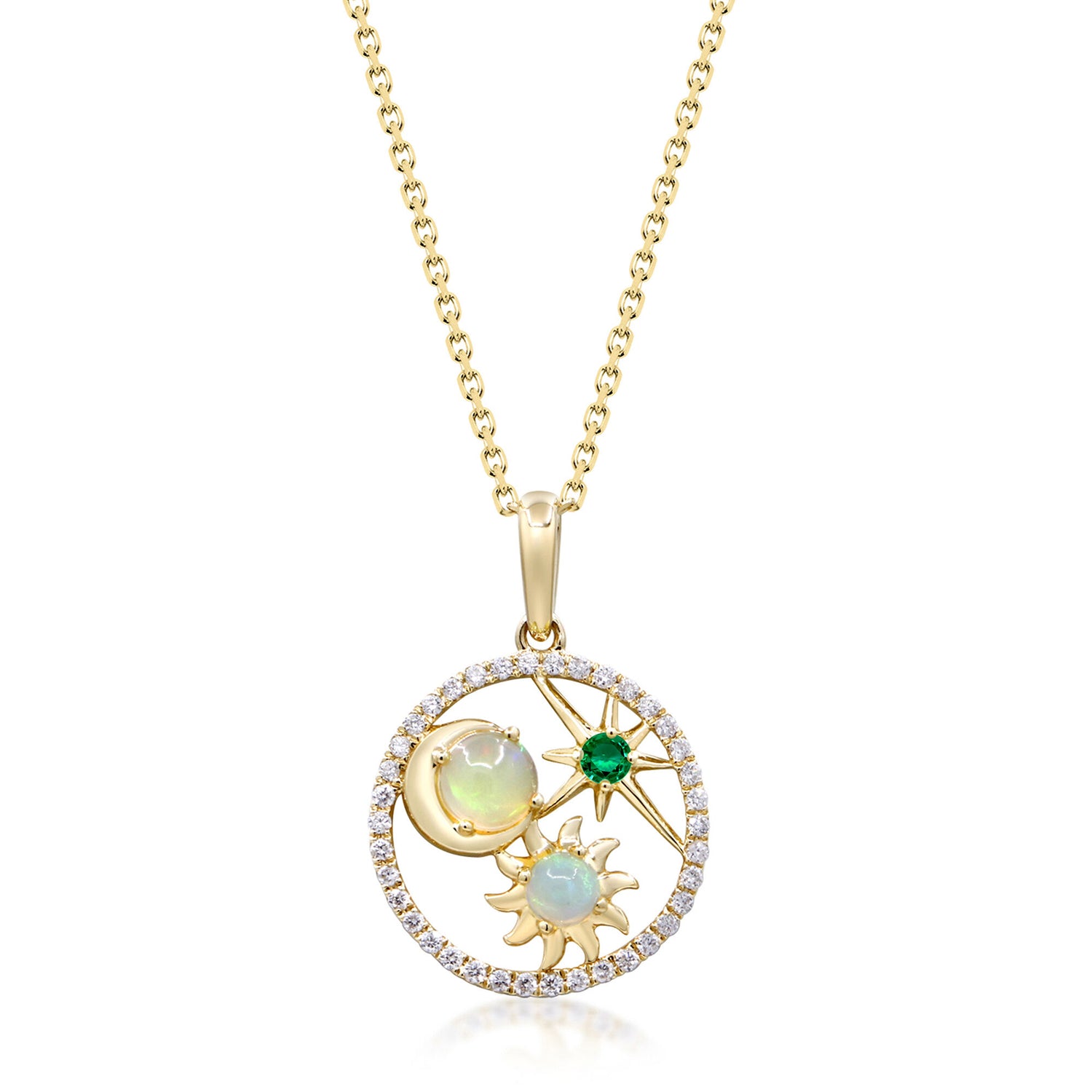 Handcrafted in 10K yellow gold, set with emerald, opals, and brilliant cut diamond accents totaling 1/8 carat. Multi-gemstone pendant design.