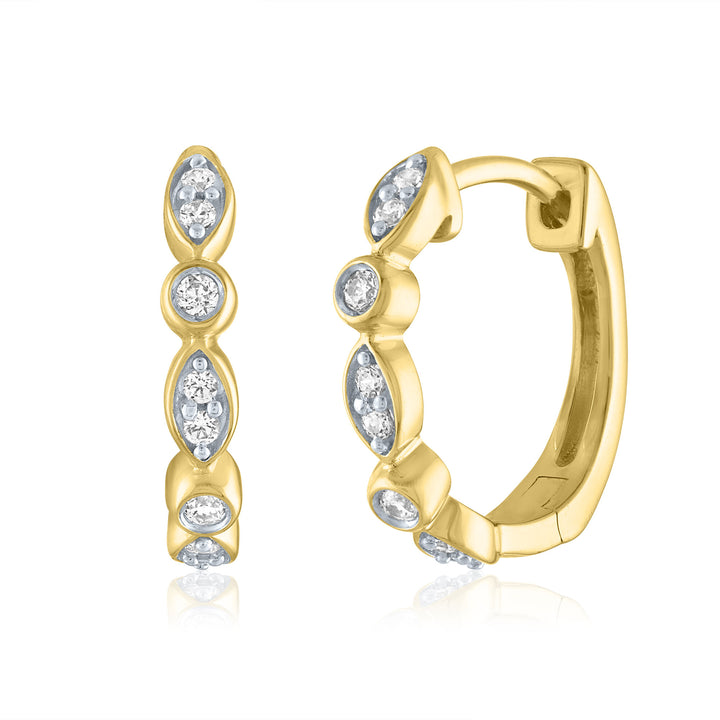 Handcrafted in 10K yellow gold, set with eight round brilliant cut diamonds per earring totaling 1/10 carat total weight. Huggie hoop earring design.