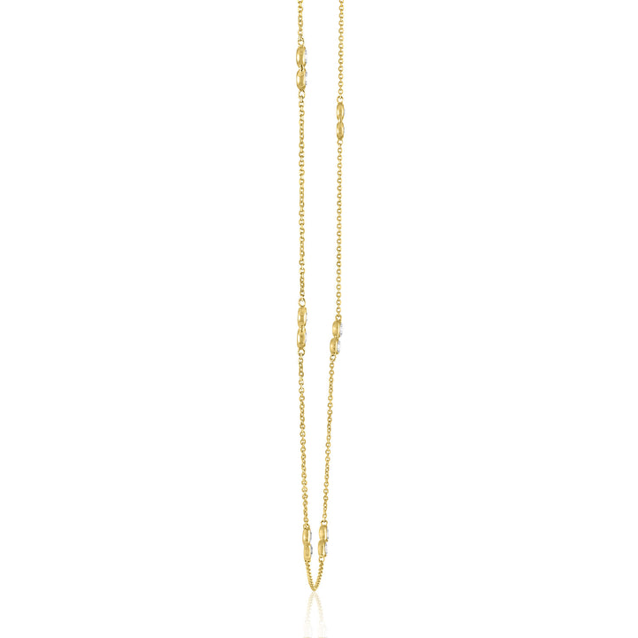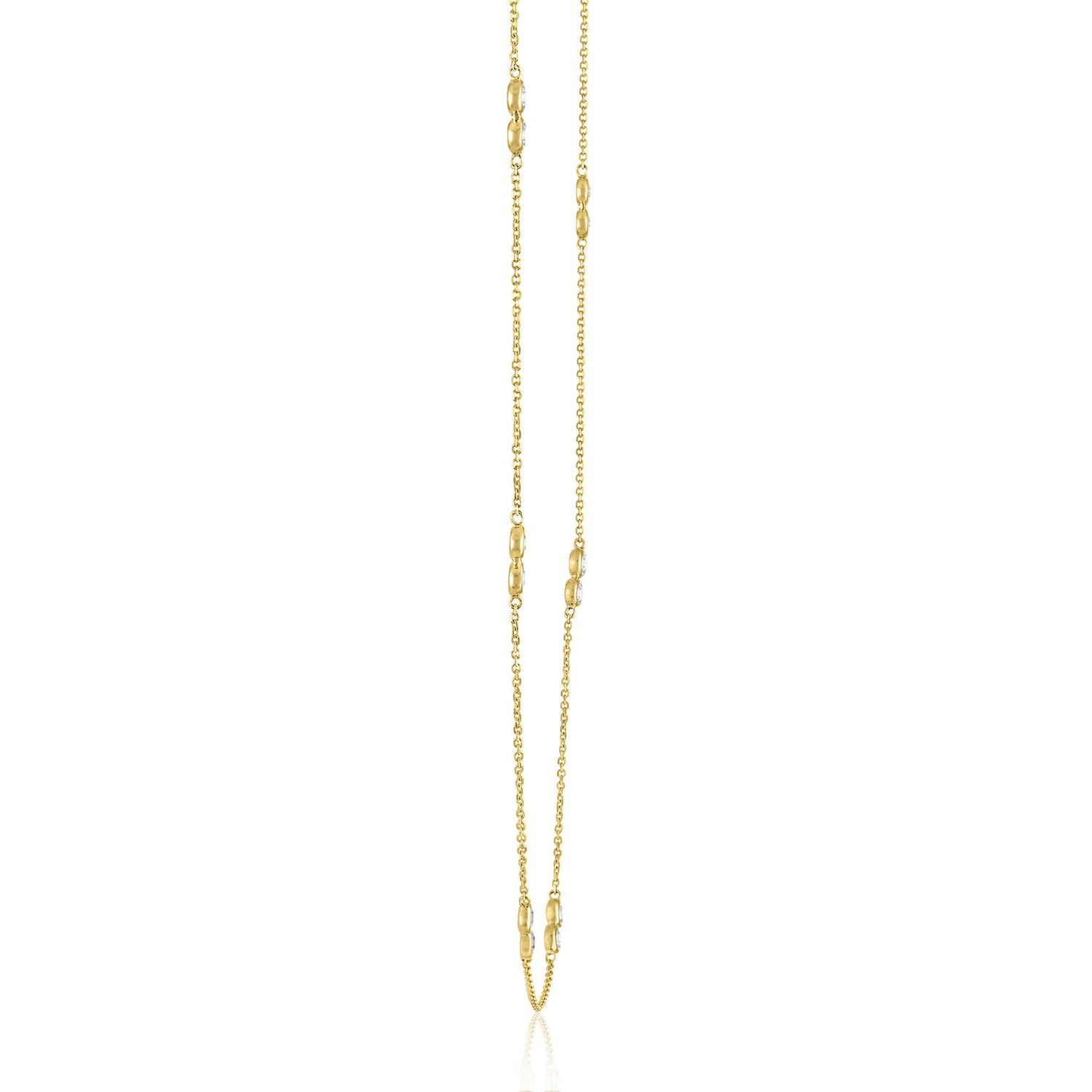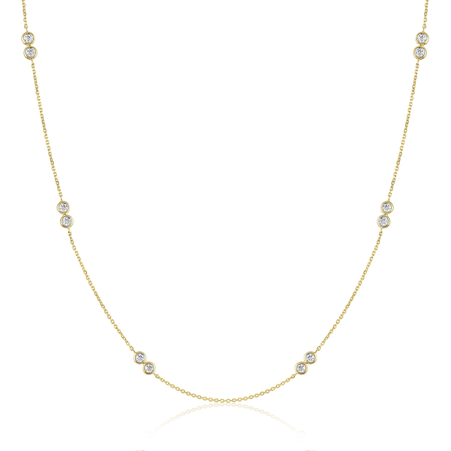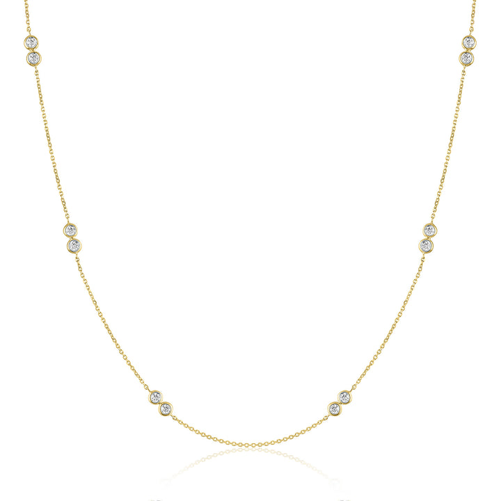 Handcrafted in 10K yellow gold, set with twelve round brilliant cut bezel-set diamonds totaling 1/4 carat total weight. Adjustable double bezel necklace design.