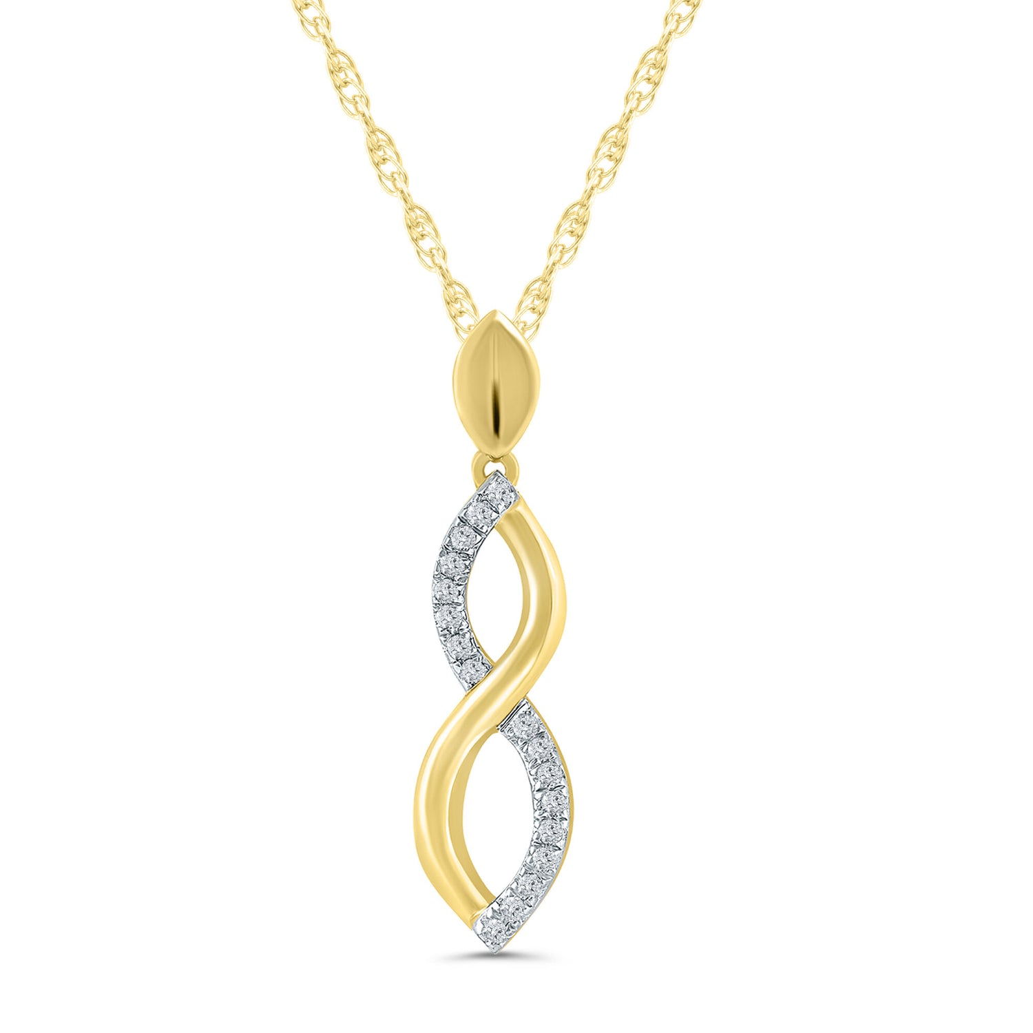 This Diamond Accent Twist Infinity Pendant by Helzberg offers a graceful touch of glamour. Crafted in 10K yellow gold, the elegant twisted design is adorned with 17 round single cut diamonds, creating a stunning shimmer and a lasting impression of refined style.