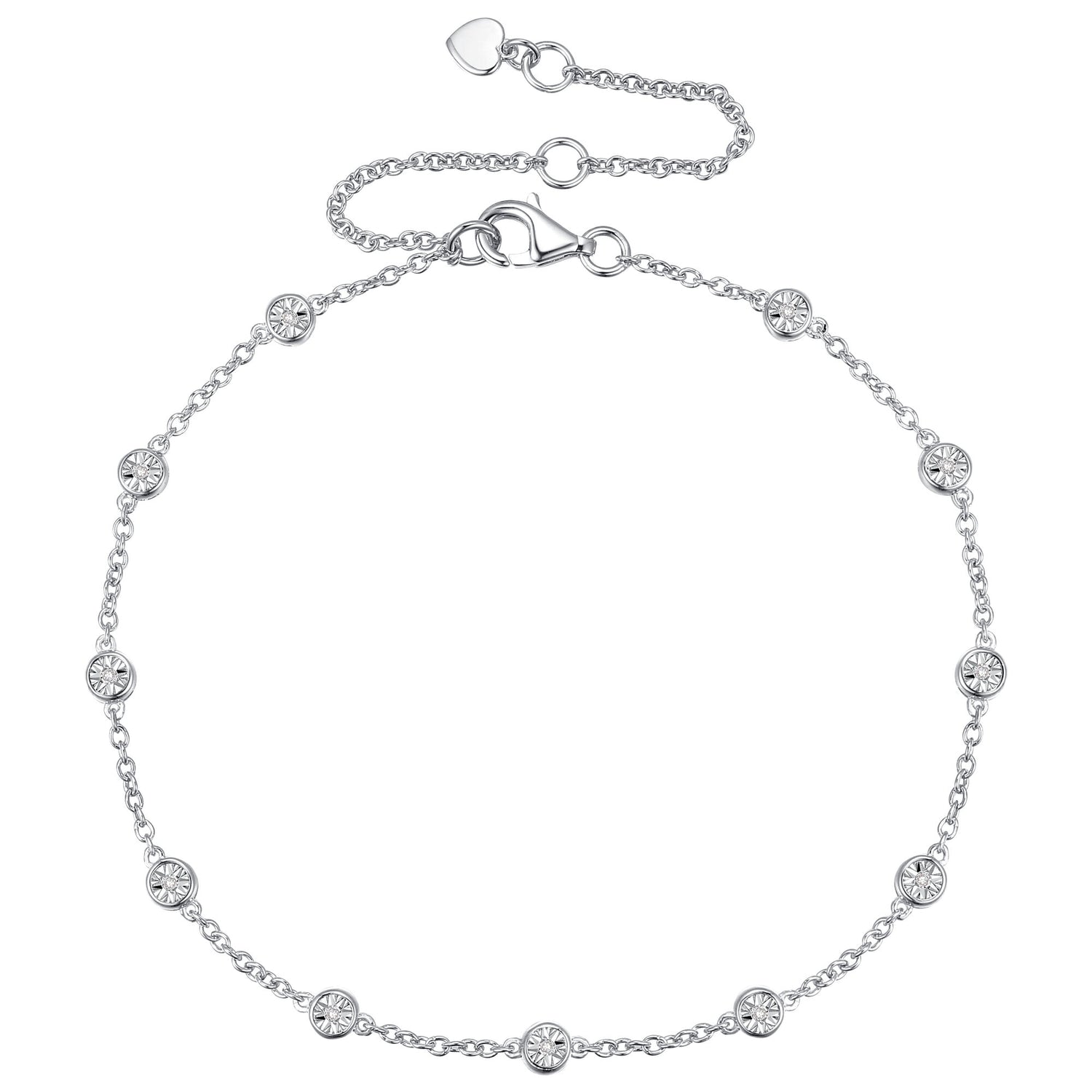 Crafted in sterling silver with eleven round single cut diamonds. Total diamond weight approximately 1/10 carat. Adjustable length 7 inches with lobster clasp.