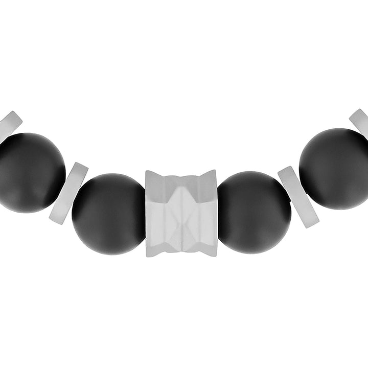 Crafted in gray stainless steel with eighteen 10mm matte black onyx beads. Adjustable bolo clasp, fits 8.5 to 10.5 inches.