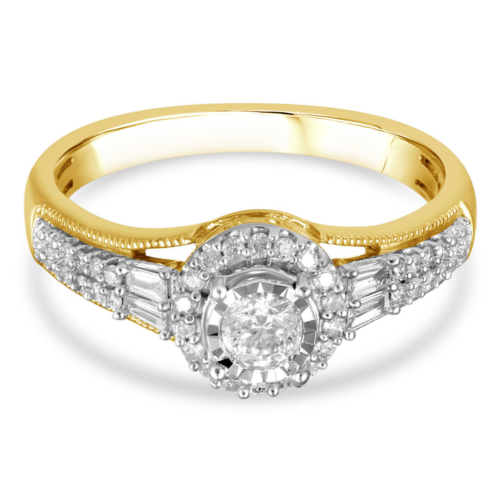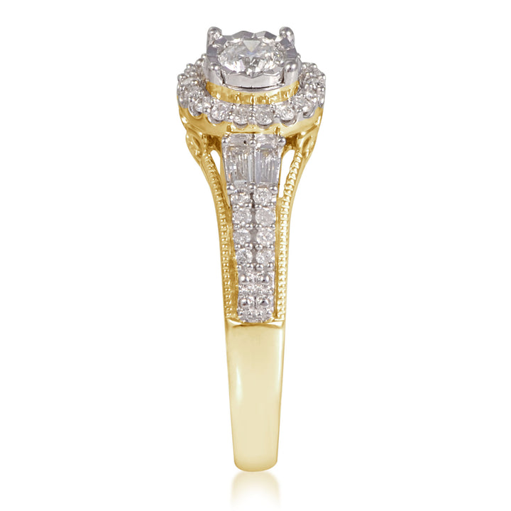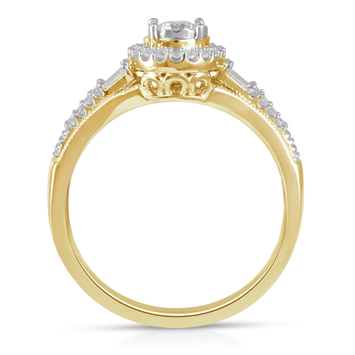 This Diamond Halo Engagement Ring by Helzberg showcases a classic design in 10K yellow gold. Centered by one round brilliant cut diamond and accented with four baguette diamonds and 34 round brilliant cut diamonds, this ring symbolizes enduring love and sophistication, perfect for your most treasured moments.