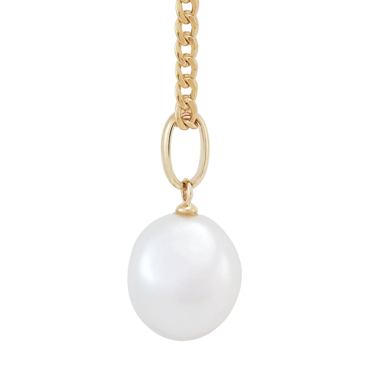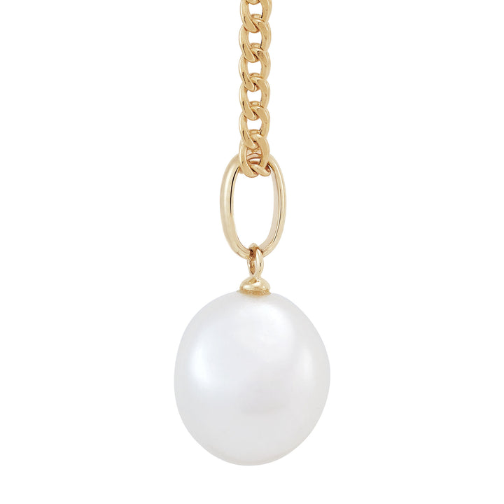 Crafted in 10K yellow gold with one off-round cultured freshwater pearl on a hollow curb chain. Chain length and pearl size not specified.
