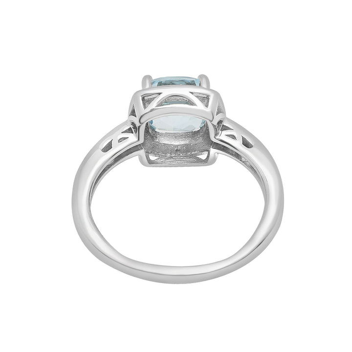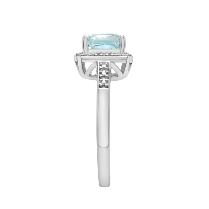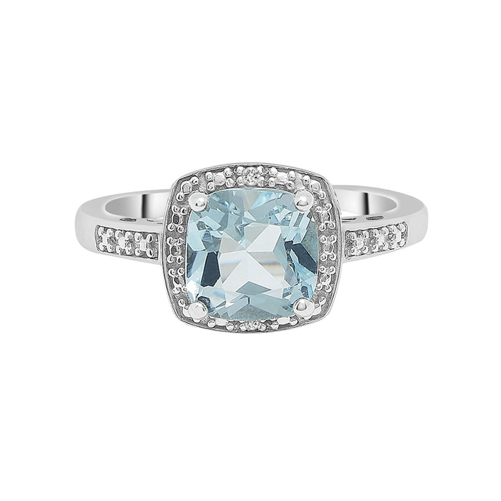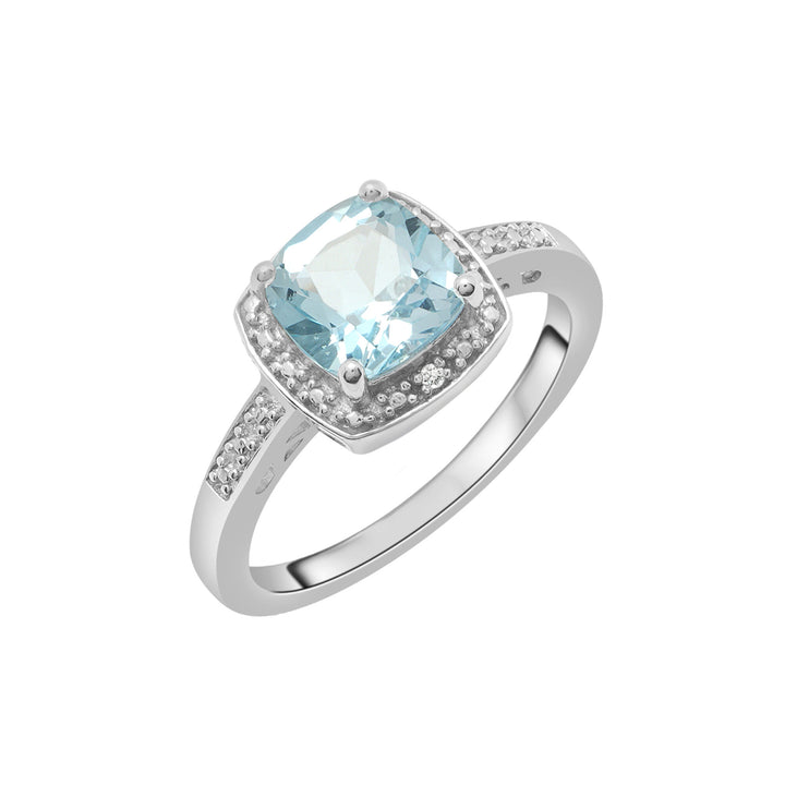 Crafted in sterling silver with one cushion-cut blue topaz and two round single cut diamonds. Exact stone measurements not specified.