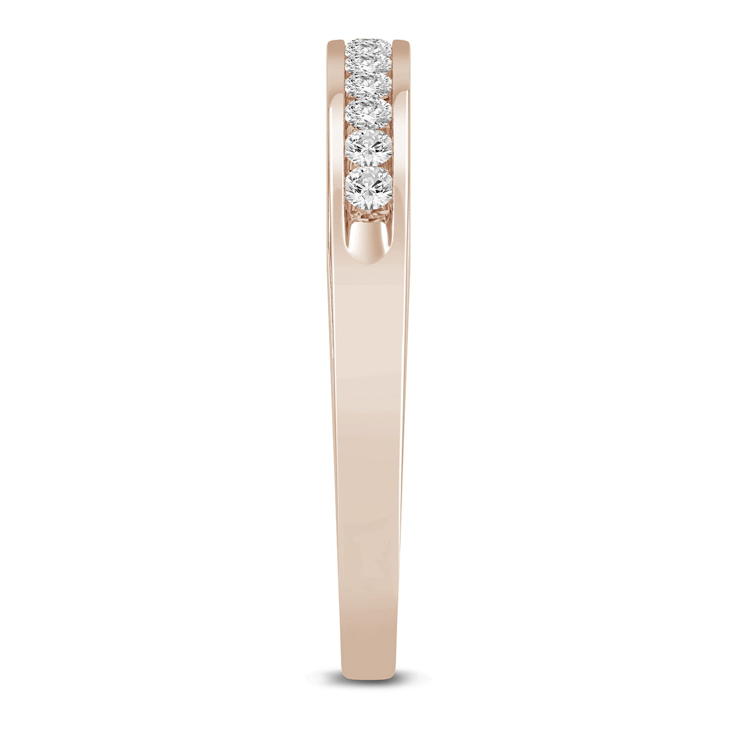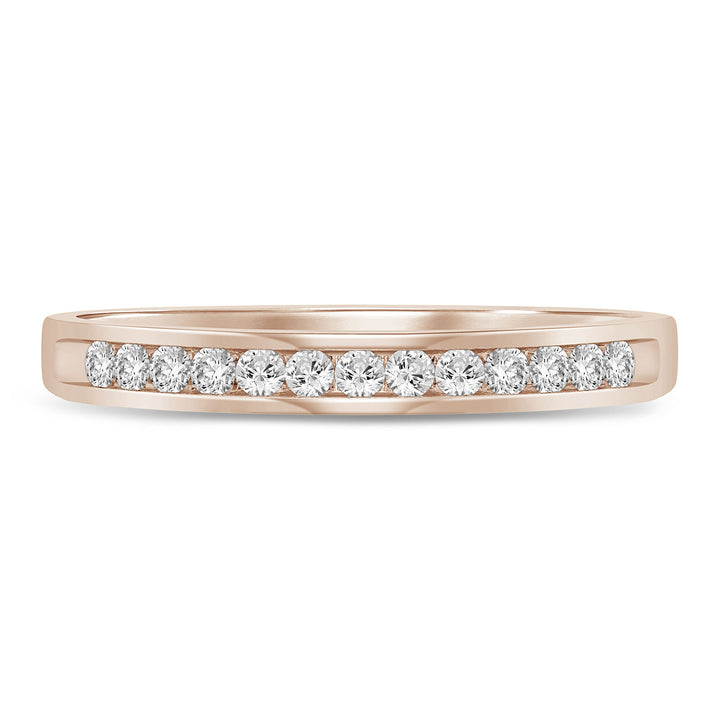 Crafted in 14K rose gold with 13 round brilliant cut diamonds totaling approximately 1/7 carat total weight. Designed for comfort and enduring shine.