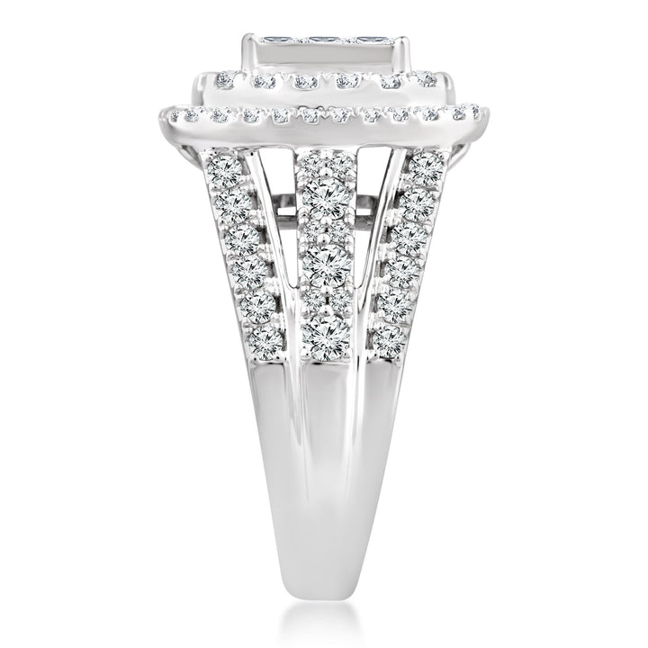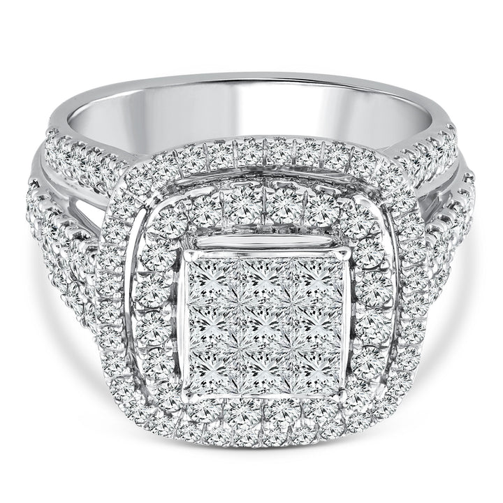 Crafted in 10K white gold featuring nine princess cut center diamonds and 98 round brilliant cut diamonds totaling approximately 2 carats total weight. Designed with a secure setting for lasting brilliance.