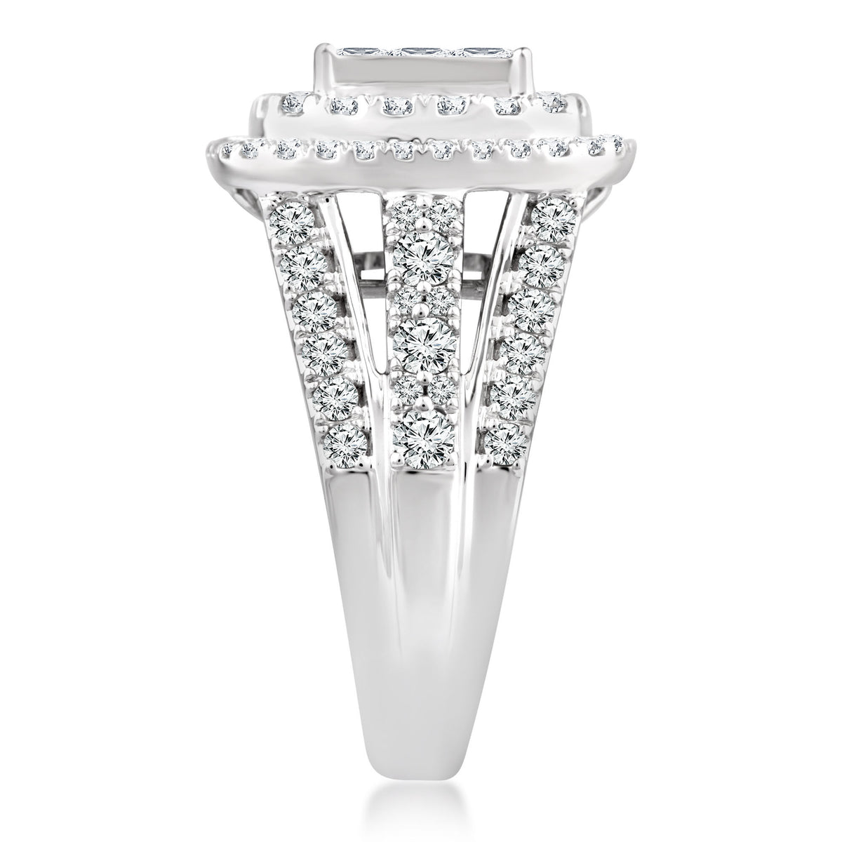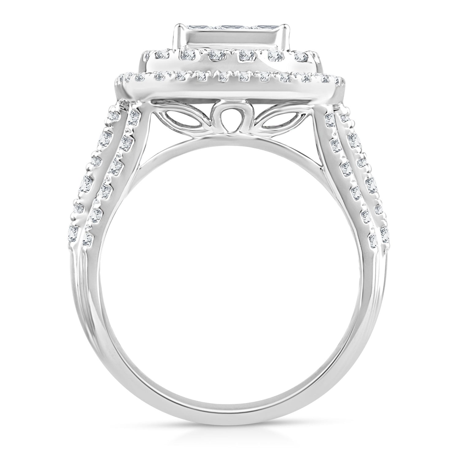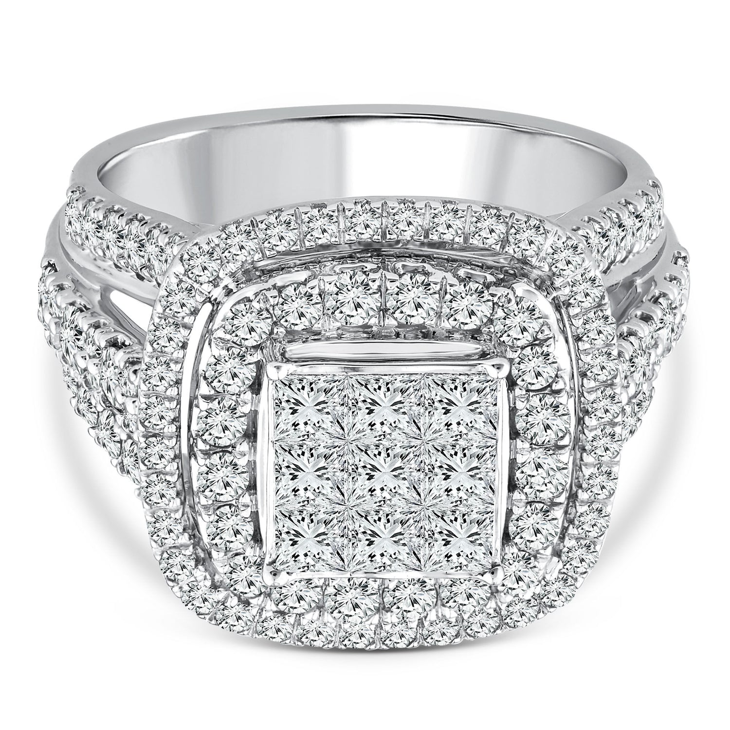 This Composite Diamond Engagement Ring in 10K White Gold by Helzberg dazzles with a stunning cluster of nine princess cut diamonds at its center, surrounded by 98 round brilliant cut diamonds for breathtaking sparkle. Crafted in gleaming 10K white gold, this ring is a radiant symbol of enduring love and timeless elegance, perfect for a lifetime of cherished moments.