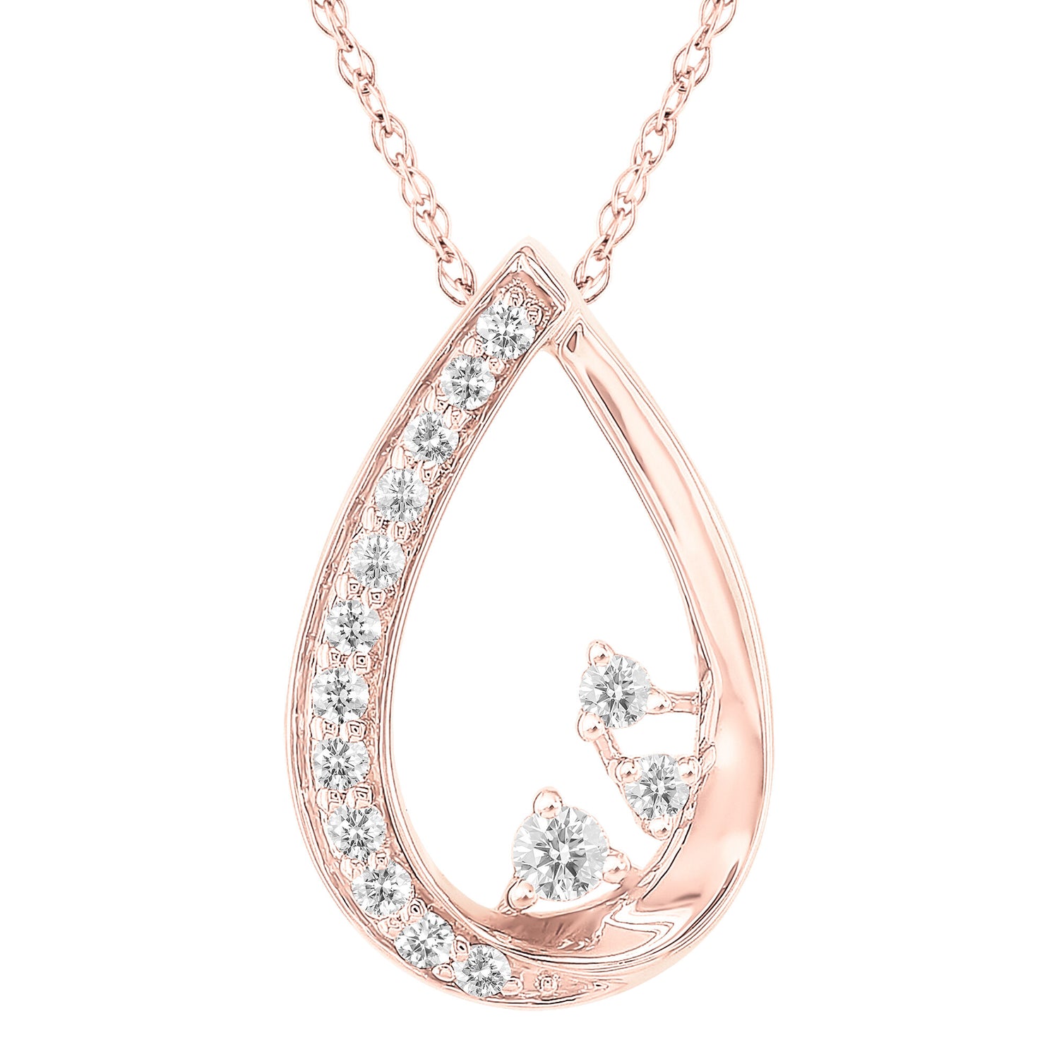 This Teardrop Pendant with Diamond Accents in 10K Rose Gold by Helzberg is a delicate, eye-catching piece featuring 15 round brilliant cut diamonds set in a refined teardrop design. The polished rose gold adds warmth and elegance, making this pendant a versatile and graceful addition to any collection.