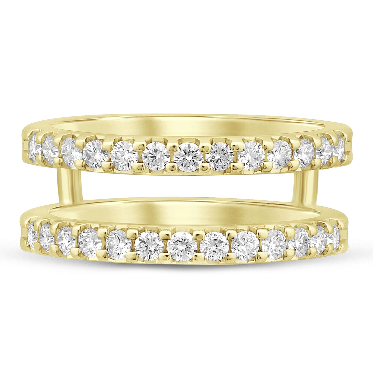 This Diamond Enhancer in 14K Yellow Gold by Helzberg embodies timeless elegance with its slender silhouette and dual rows of brilliant cut diamonds. The gleaming yellow gold setting enhances the radiance of the gemstones, making it a perfect complement to any engagement ring. This piece symbolizes warmth and devotion, ideal for elevating your treasured jewelry with refined sparkle.
