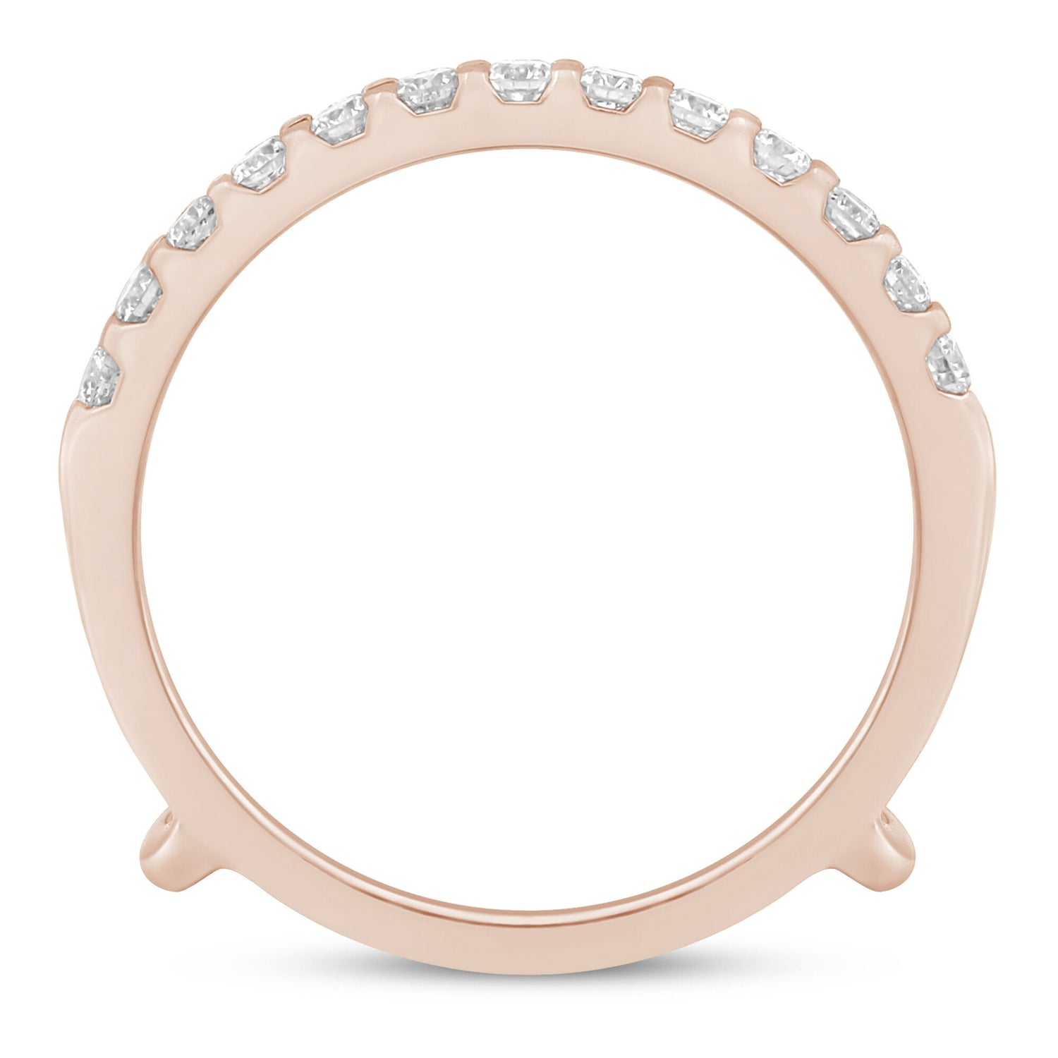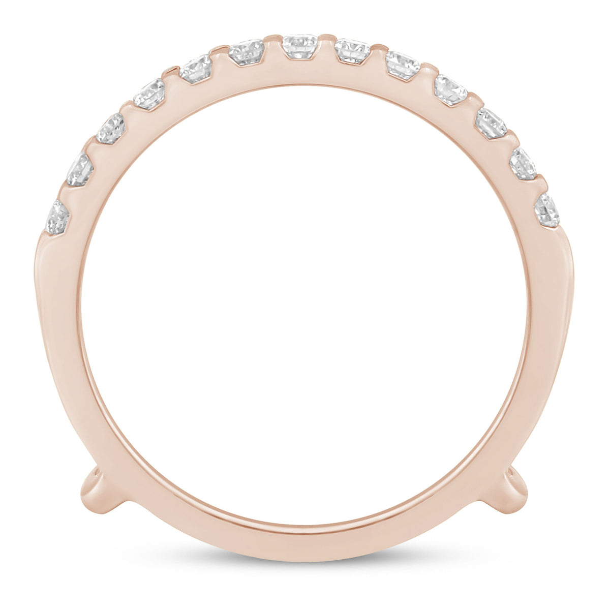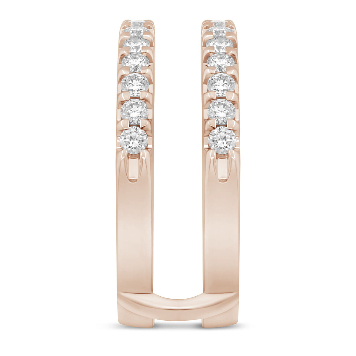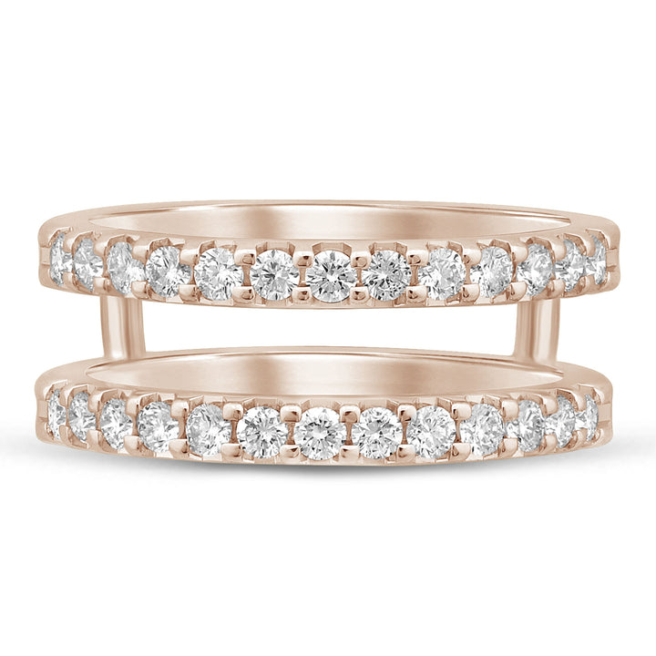 This Diamond Enhancer in 14K Rose Gold by Helzberg is an elegant, slender accessory featuring two rows of brilliant cut diamonds. The refined design offers lustrous sparkle and graceful enhancement to any heirloom engagement ring. The warm rose gold setting complements the dazzling gemstones, symbolizing love and sophistication in a piece meant to elevate your jewelry collection.